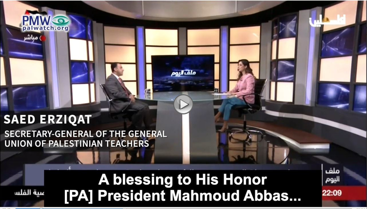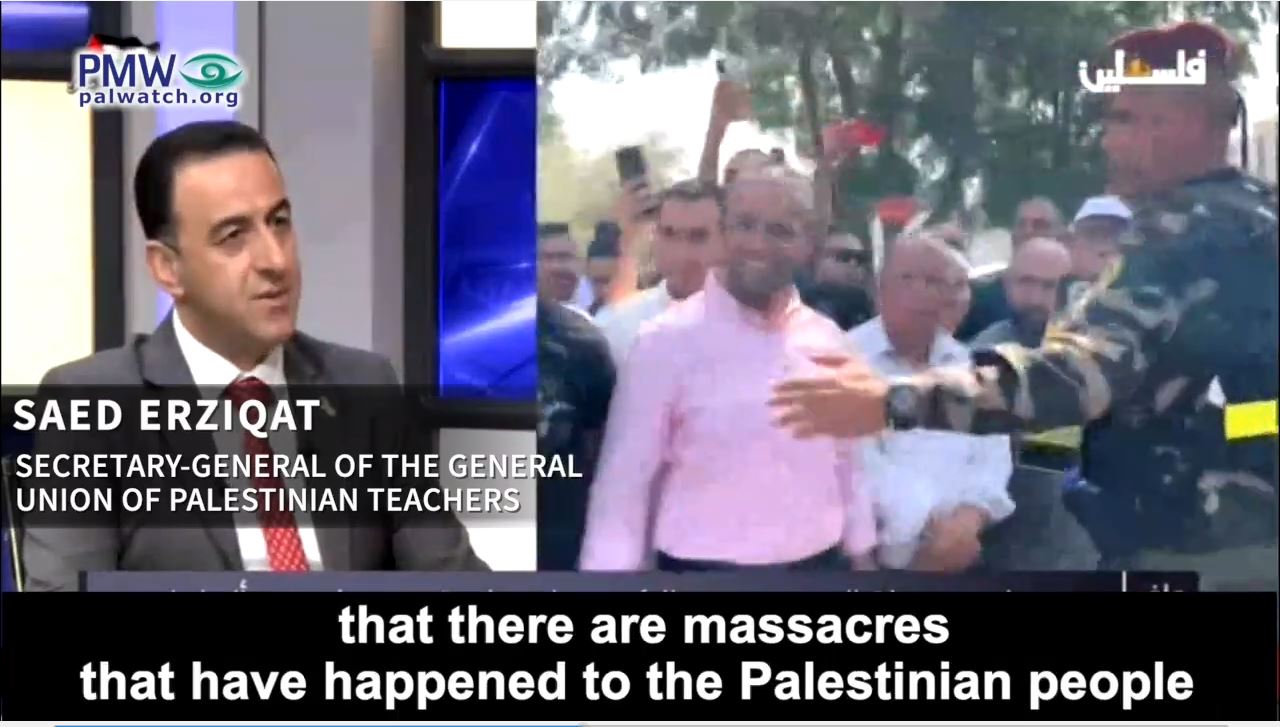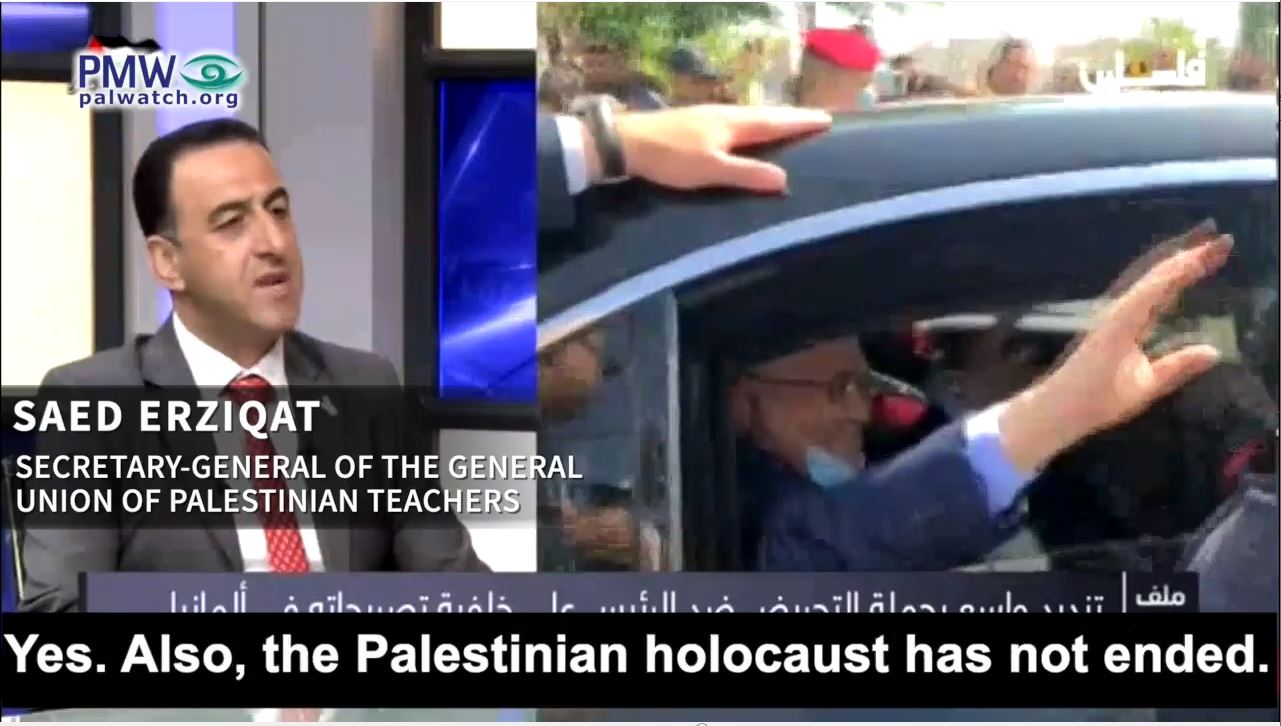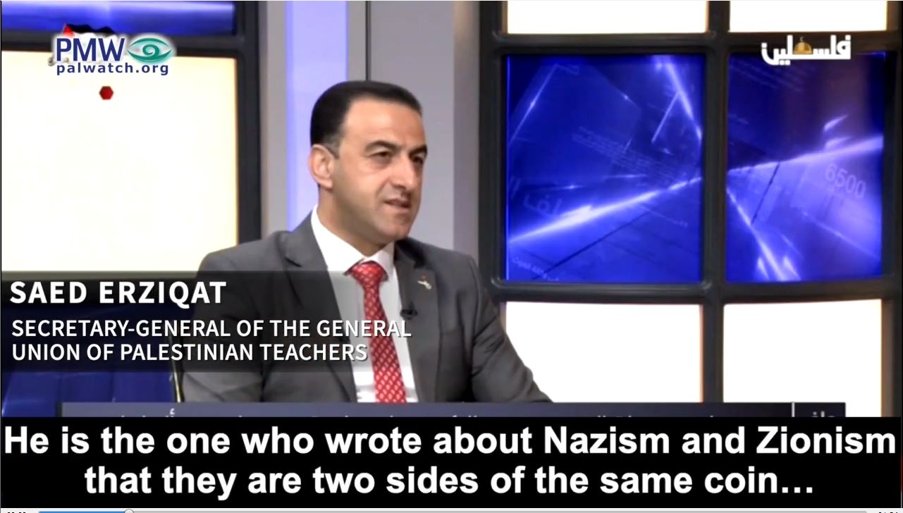 Secretary-General of the General Union of Palestinian Teachers Saed Erziqat: “A blessing to His Honor [PA] President Mahmoud Abbas, He is the one who wrote about Nazism and Zionism, that they are two sides of the same coin… When His Honor the President spoke [in Germany] about [50 Palestinian] holocaust[s] he did not deny what happened to the entity- and the Jews in Germany, rather he attempted to show that the Palestinian people has also been subjected to massacres, more than the Jews in Germany experienced… We in the Palestinian Teachers’ Union sent a letter to the German teachers’ union that there are massacres that have happened to the Palestinian people that were worse than the Holocaust itself.”