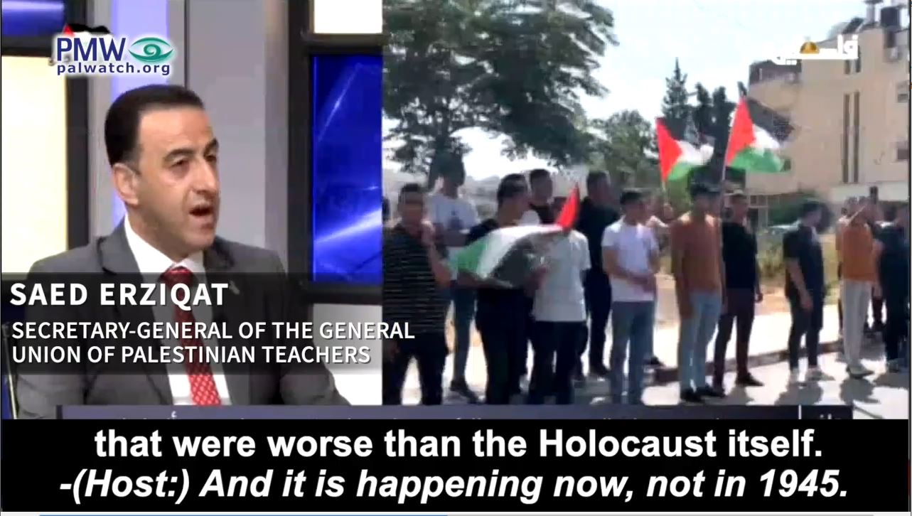 But now Saed Erziqat, the head of the PA’s General Union of Palestinian Teachers that represents 60,000 educators, has revealed that the teachers’ union has adopted a hate ideology of Holocaust “relativization” and Antisemitism. Erziqat came to the defense of Abbas’ “50 holocausts” libel. The teachers’ union leader repeatedly compared Israel to Nazis, saying that what Israel has done to the Palestinians is “worse than the Holocaust itself”: