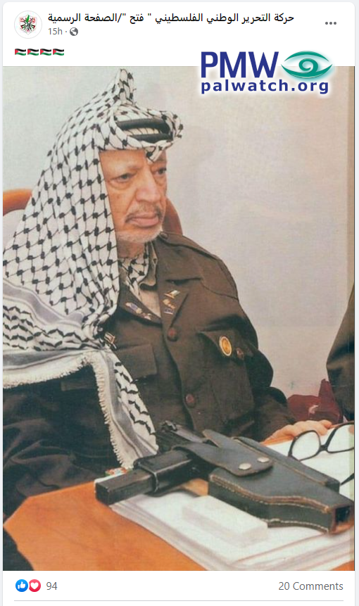 Fatah Facebook page shows Arafat as a warrior, in uniform and with a gun