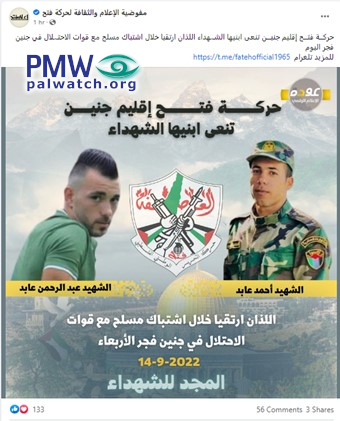 Posted text: “The Fatah Movement’s Jenin branch eulogizes its two Martyr sons [Ahmed Abed and Abd Al-Rahman Abed] (i.e., terrorists, murdered 1) who ascended to Heaven during armed struggle with the occupation forces in Jenin at dawn this morning [Sept. 14, 2022]”