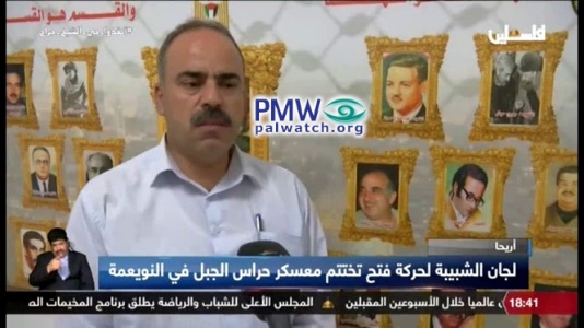 Official PA TV newsreader: “The Fatah Movement Shabiba High School Committees concluded the ‘Guardians of the Mountain’ camp in Nu’eima, which is in Jericho. The camp was established to find a place for extracurricular activities and to teach the participants the principles of affiliation, discipline, coexistence among themselves, and to familiarize them with the missions of the [PA] Security [Force] members.”