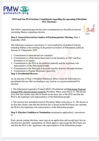 “(All errors in source -Ed.) The follow sequencing present the latest commitments by all political factions (including Hamas) [parentheses in source] regarding election: