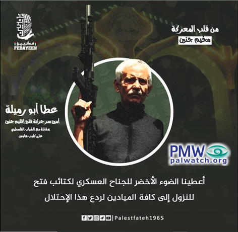 The image shows Fatah Jenin Branch Secretary Ata Abu Rmeileh holding an assault rifle.
