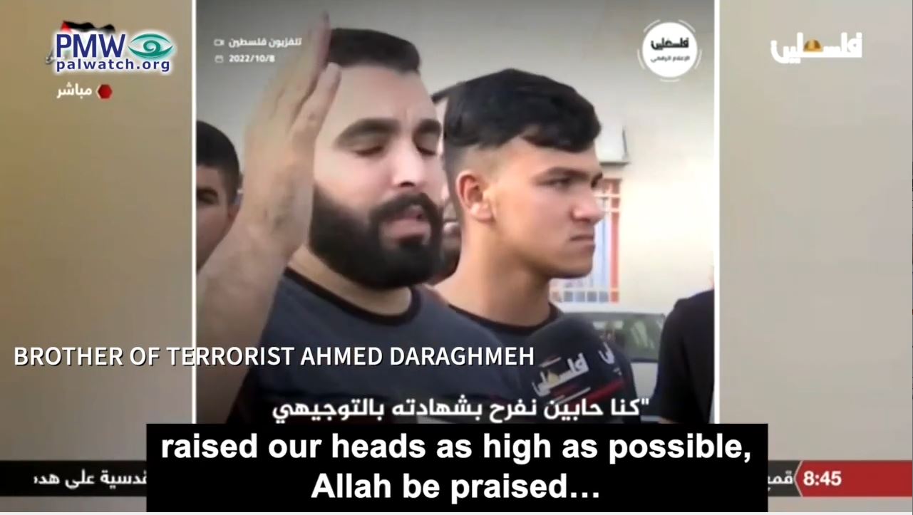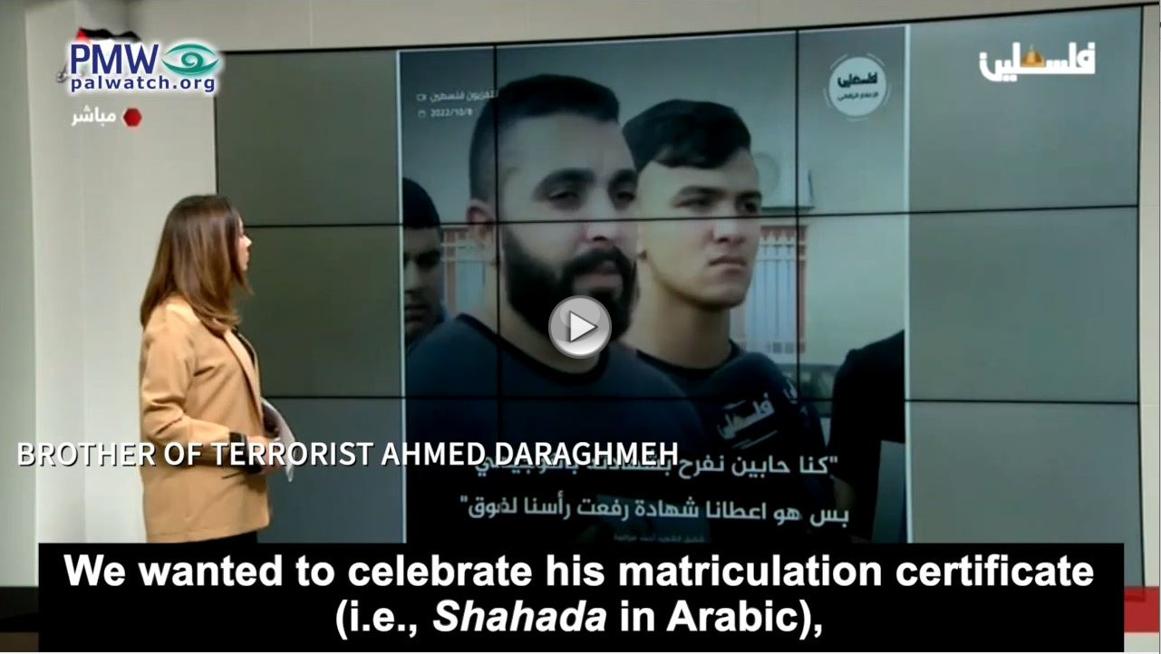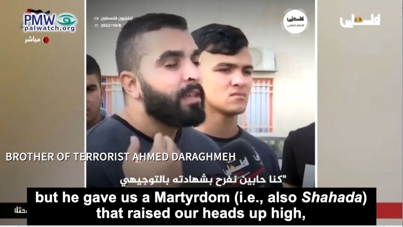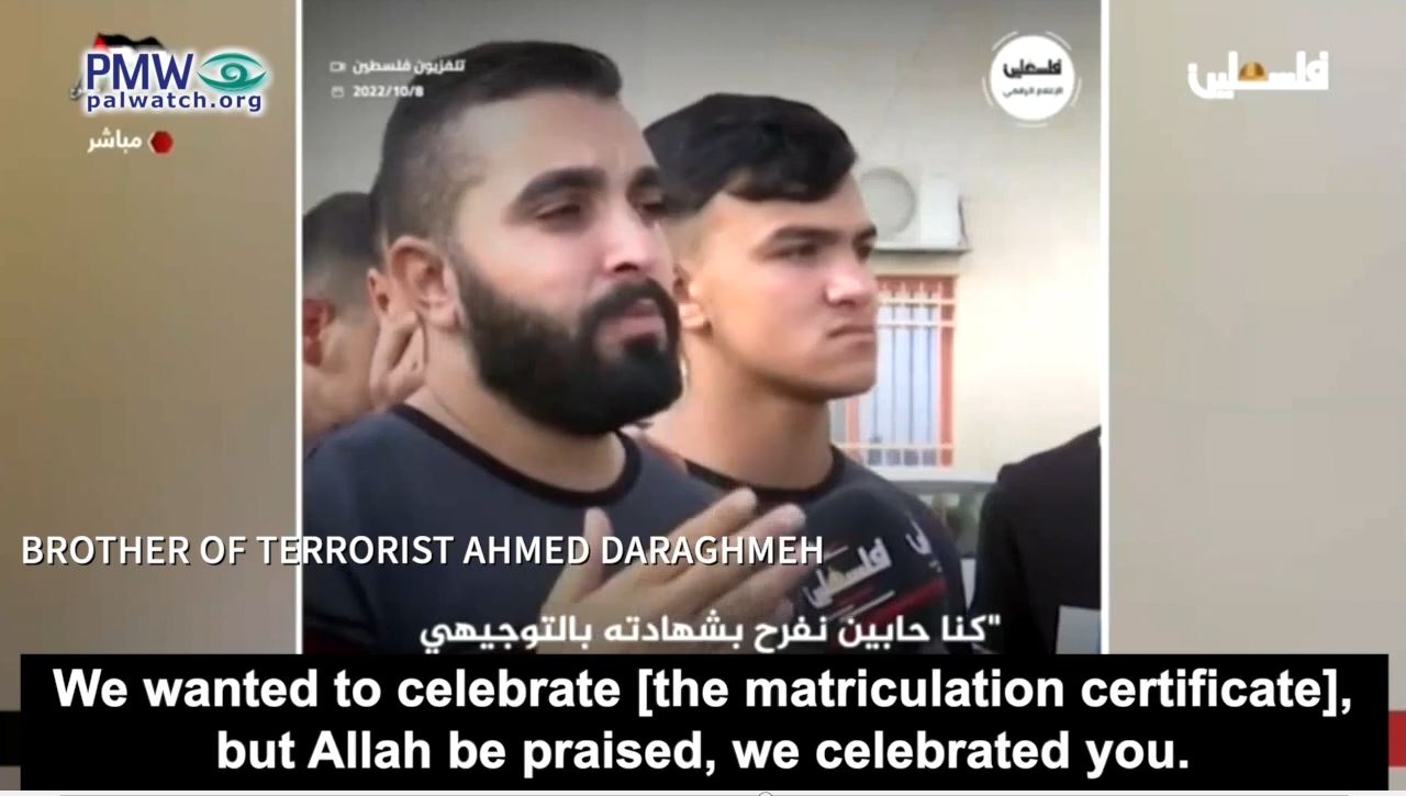 Brother of terrorist Ahmed Daraghmeh: “We wanted to celebrate his matriculation certificate (i.e., Shahada in Arabic), but he gave us a Martyrdom (i.e., also Shahada) that raised our heads up high, raised our heads as high as possible, Allah be praised… We wanted to celebrate [the matriculation certificate], but Allah be praised, we celebrated you. And here all the people and all the young people are around you. They want to celebrate you and accompany you [to your wedding] Allah be praised.”