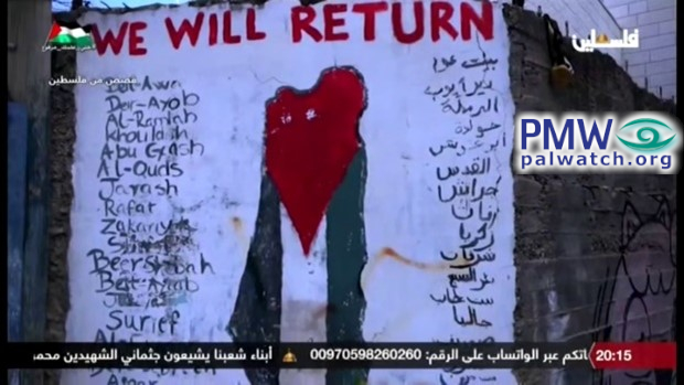 A wall is shown with graffiti featuring the PA map of “Palestine” that presents all of Israel together with the PA areas as “Palestine” in the colors of the Palestinian flag. Above the map is written in English: “We will return.”