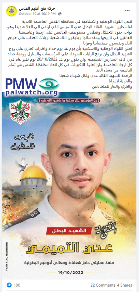 Posted text: “The [Palestinian] National and Islamic Forces in the district of Jerusalem, Palestine’s eternal capital, eulogized heroic commander Martyr Uday Al-Tamimi (i.e., terrorist, murdered 1), who ascended to Heaven as a Martyr while confronting the occupation soldiers and settler herds (sic., he died after shooting at Israeli security guards and wounding 1) crouching on our land and our capital, who are harming its history and its holy sites, causing our people to taste the suffering of torture at the checkpoints of humiliation, and desecrating our holy sites and our villages…