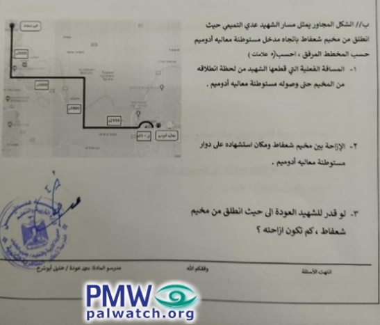 “A picture was published on social media of a physics test for students at one of Palestine’s schools, which includes a question on the operation (i.e., terror attack) carried out by Martyr Uday Al-Tamimi (i.e., terrorist, murdered 1) in Jerusalem, which is known as [the] ‘Shuafat’ [operation].”