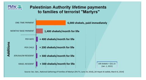 As a basic payment, the PA pays the family of a dead terrorist 1,400 shekels ($396) per month with additions if the dead terrorist was married or had children.