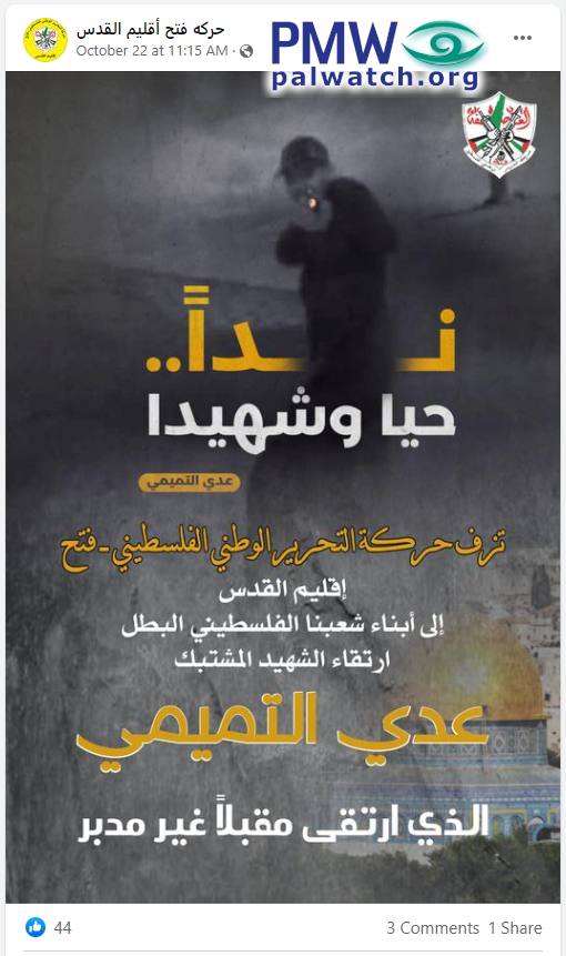 Fatah Jerusalem branch post glorifies terrorist murderer Uday Al-Tamimi