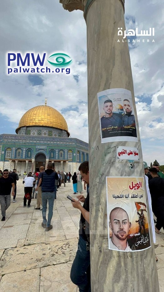 The article includes a picture of posters hung on a pillar at the Temple Mount, with the Dome of the Rock seen in the background. The bottom poster shows the face of terrorist Uday Al-Tamimi next to the image of a man holding a Palestinian flag.