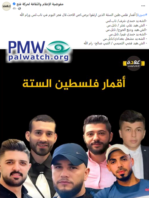 Posted text: “In the picture: The six moons of Palestine who were shot by the occupation and ascended to Heaven early this morning [Oct. 25, 2022] in Nablus and Ramallah