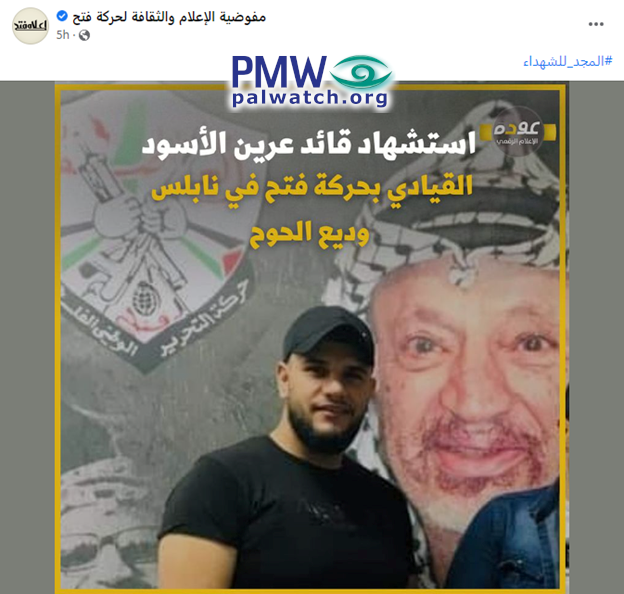 The image shows senior member of the independent terror cell “The Lion’s Den” Wadi’ Al-Houh, who shot at Israeli security forces raiding a headquarters of the cell and was killed along with 4 other terrorists. On the right is former PLO and PA Chairman Yasser Arafat, and on the left is the Fatah logo that includes a grenade, crossed rifles, and the PA map of “Palestine” that presents all of Israel together with the PA areas as “Palestine.” In the upper right corner is the logo of Fatah-run Awdah TV.
