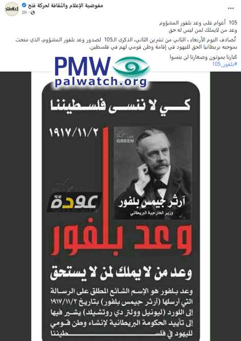 Posted text: “105 years since the ominous Balfour Promise (i.e., Declaration)