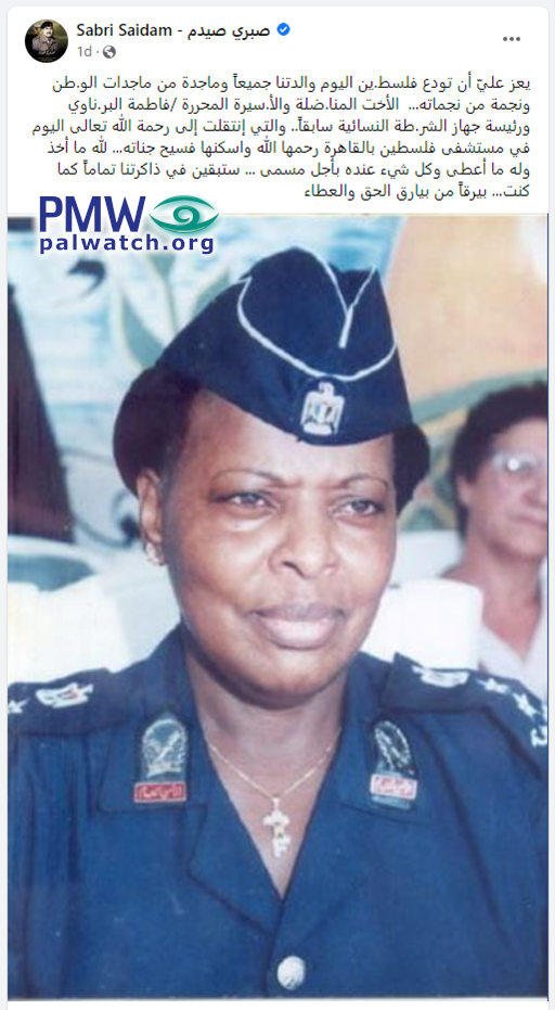 Posted text: “It is an honor for me that Palestine is bidding farewell today [Nov. 3, 2022] from the mother of us all, one of the lauded women of the homeland, and one of its stars, fighting sister and released prisoner Fatima Barnawi (i.e., terrorist, placed bomb in movie theater)… You will remain in our memories just as you were, as one of the flags of truth and giving.”