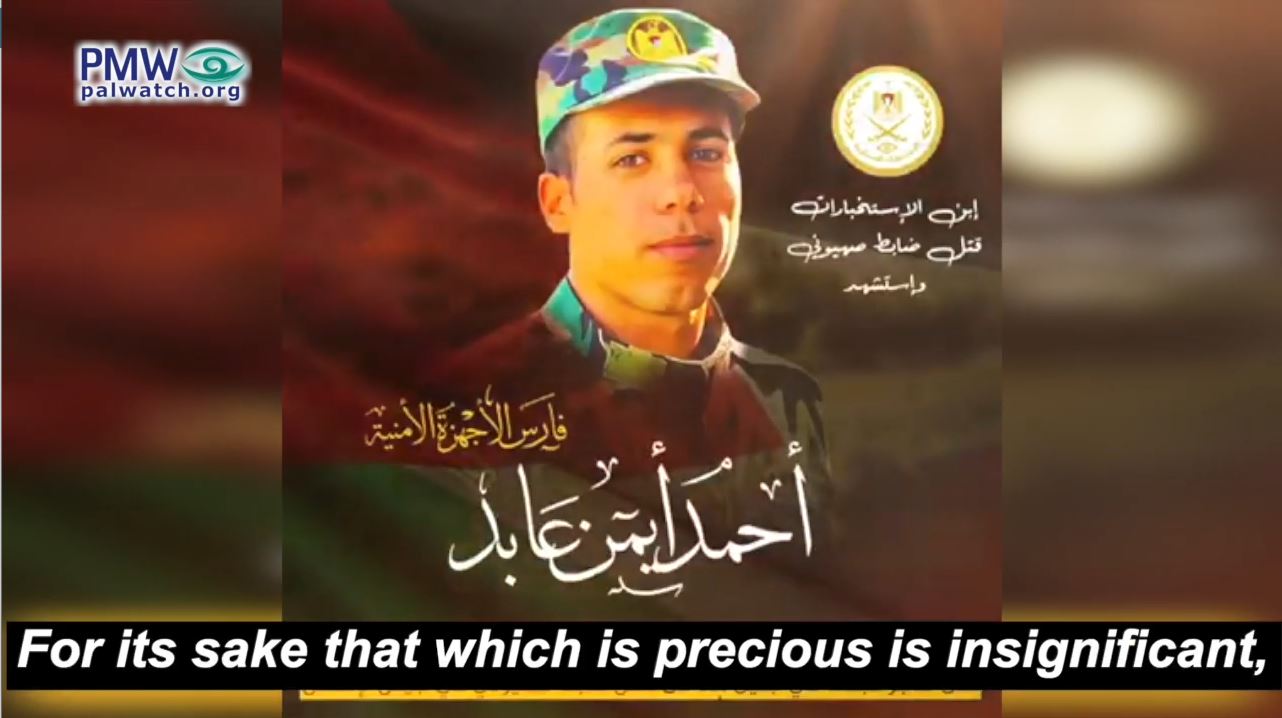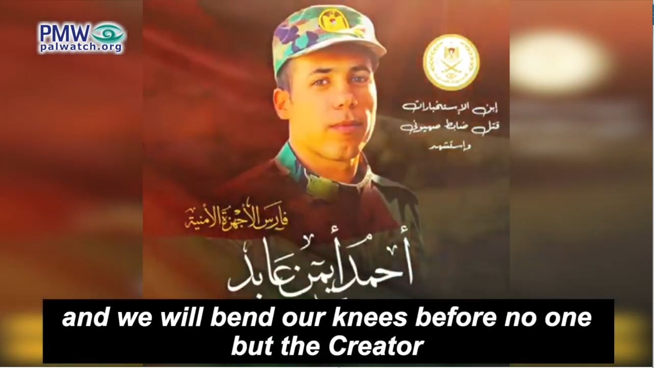 Text on screen: “A member of the [PA military] intelligence killed a Zionist officer and died as a Martyr"