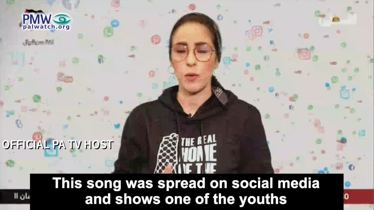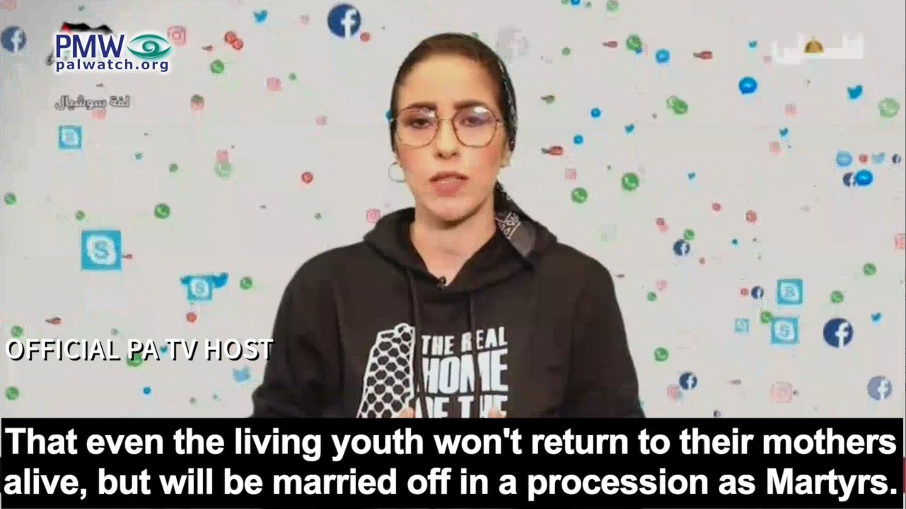 Official PA TV host: “This song was spread on social media and shows one of the youths during the confrontations with the occupation soldiers in Hebron. Perhaps there is a message in it: That even the living youth will not return to their mothers alive, but will be married off in a procession as Martyrs.”