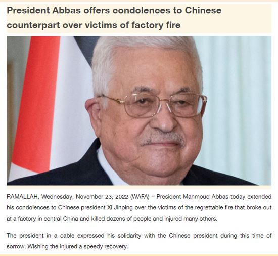 While Abbas remained silent regarding the double attack in Jerusalem, he did find time to send condolences to Chinese President Xi Jinping, for the deaths caused by a fire in China:
