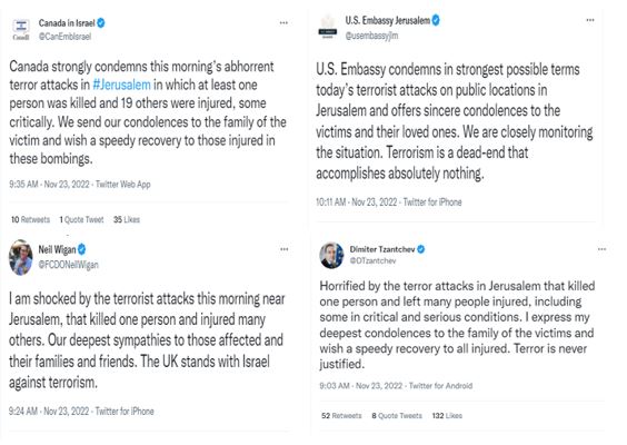 Among those who denounced the attacks within hours were the Canadian Embassy in Israel, the US Embassy in Israel, the UK Ambassador to Israel and the EU Ambassador to Israel