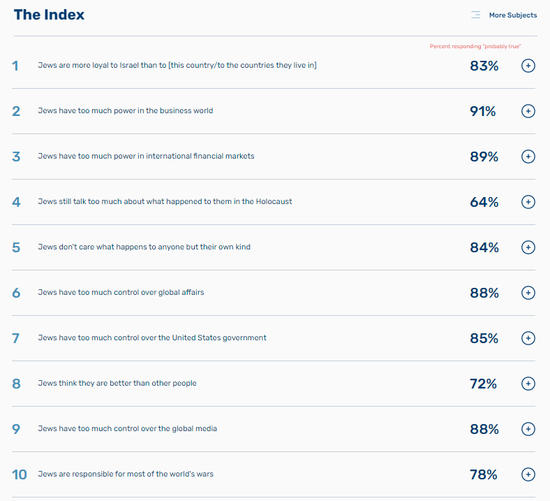 The “Index Score” represents the percentage of adults in the Gaza Strip and the PA controlled area in Judea and Samaria who answered “probably true” to a majority of the anti-Semitic stereotypes tested: