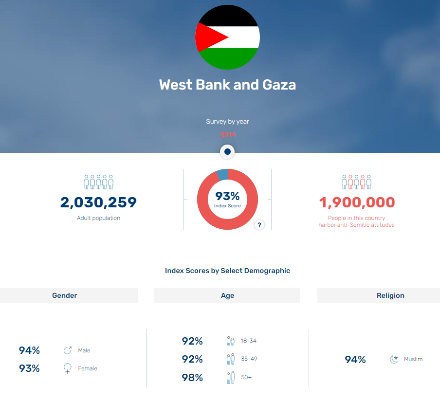 It is antisemitic sentiments such as these that were most probably reflected in a 2014 ADL poll, which found that 93% the Highest in the world of Palestinian adults - 1,900,000 out of 2,030,259 - harbor antisemitic attitudes. Since then, under the continued rule of the PA, nothing has changed.