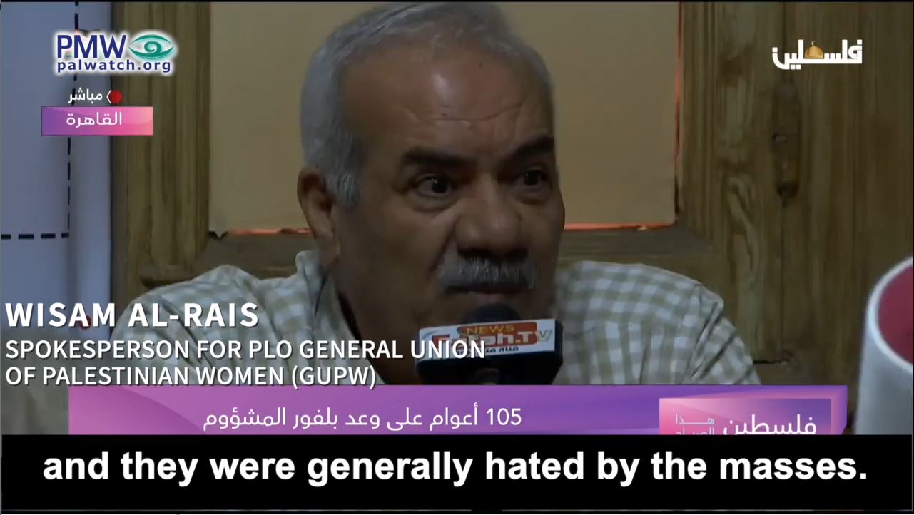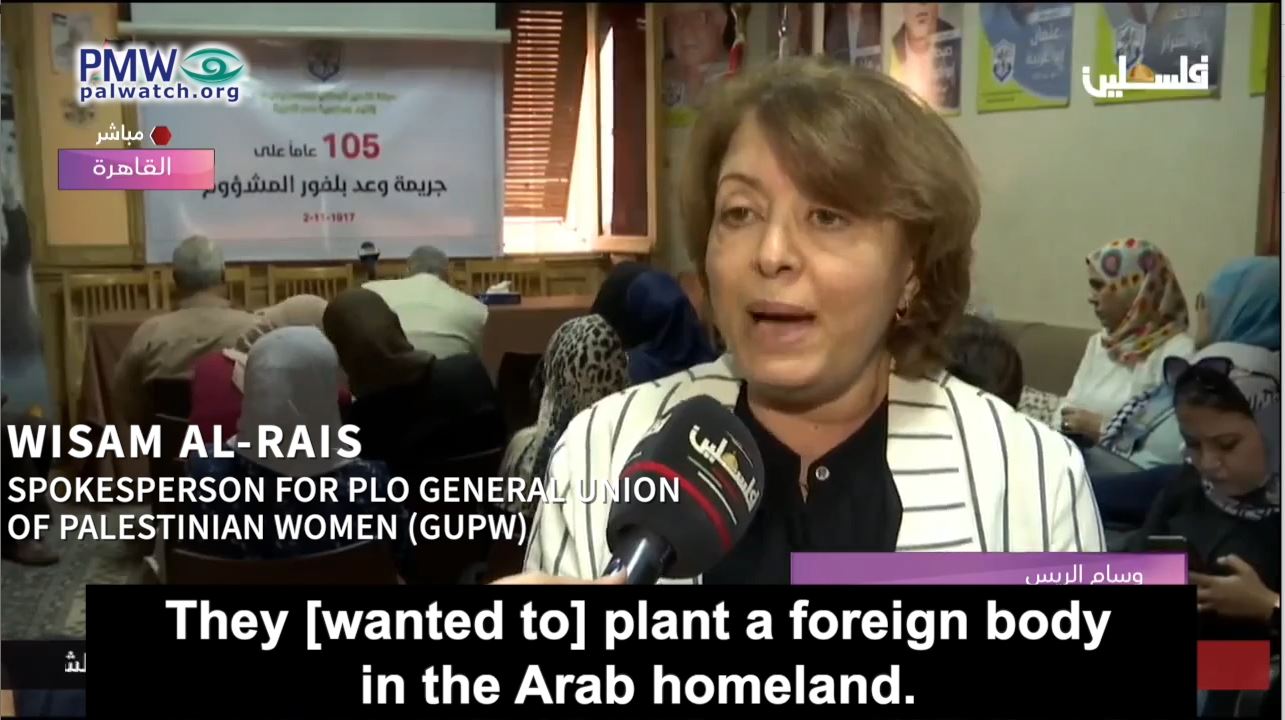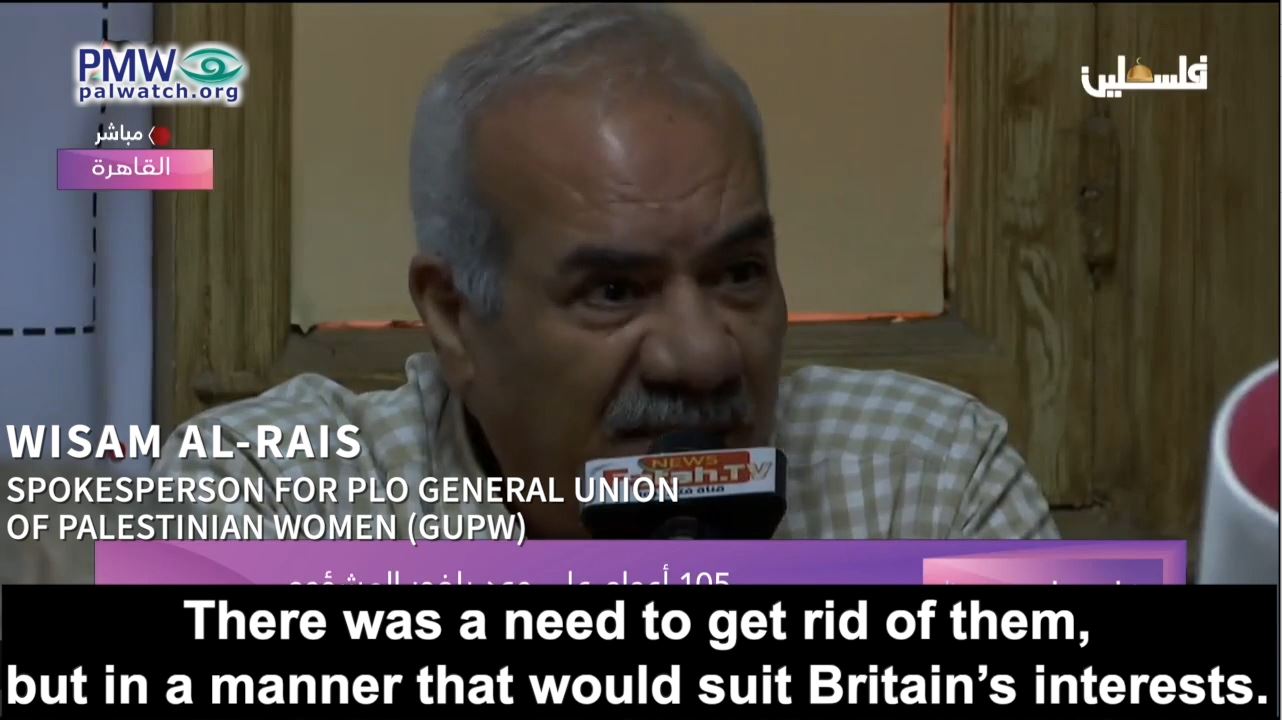 Spokesperson for PLO General Union of Palestinian Women (GUPW) Wisam Al-Rais: “The Jews’ influence increased both in Britain and in the rest of Europe, and they were generally hated by the masses. There was a need to get rid of them, but in a manner that would suit Britain’s interests. They [wanted to] plant a foreign body in the Arab homeland. This body would serve their interests and carry out their plans, and it would be a knife in the heart of the Arab world.”