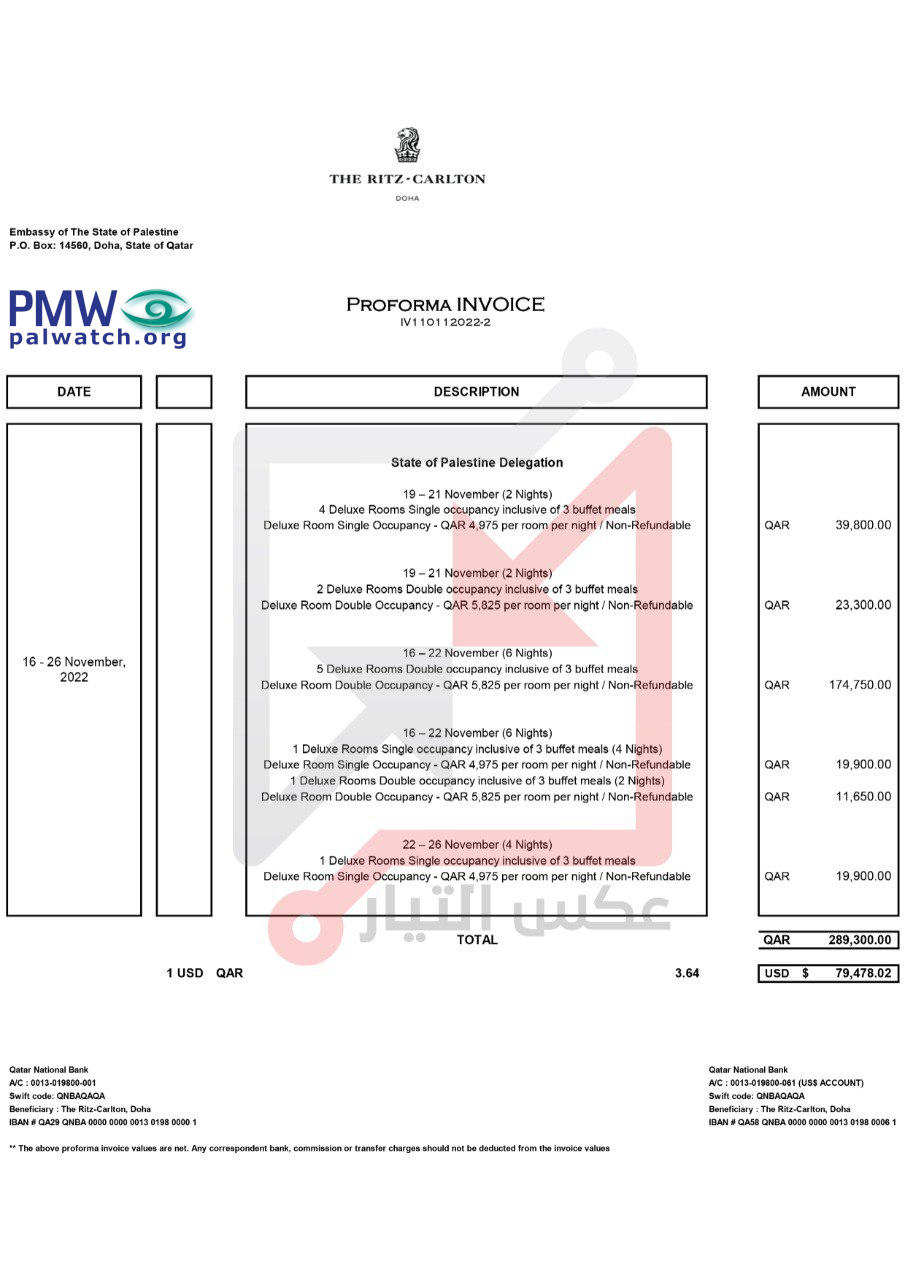 The following is a bill in the amount of USD $79,478.02 from the Ritz-Carlton for rooms for the “State of Palestine Delegation”. It is unclear who stayed in these rooms.