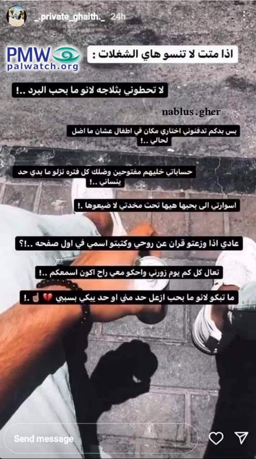Dozens of Ghaith’s friends and companions from the school bench sat on adjacent seats in the plazas of the hospital in Rafidia. They spoke about… his feeling that death was near and told each other that Ghaith was influenced by the deaths as Martyrs of three young people from Nablus in an assassination operation that the occupation forces carried out in February [2022] (refers to terrorists Adham Mabrouka Al-Shishani, Muhammad Al-Dakhil, and Ashraf Mubaslat, who were killed as they were planning an imminent shooting attack -Ed.). He told his friends that he would join them.”