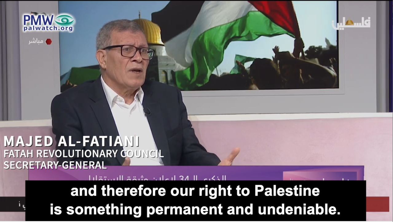 Fatah Revolutionary Council Secretary Majed Al-Fatiani: “There is not one Palestinian who would relinquish Palestine. Palestine is in the Palestinians’ memory. It is what is between the [Jordan] River and the [Mediterranean] Sea, and between the earth and the sky, and therefore our right to Palestine is something permanent and undeniable.”
