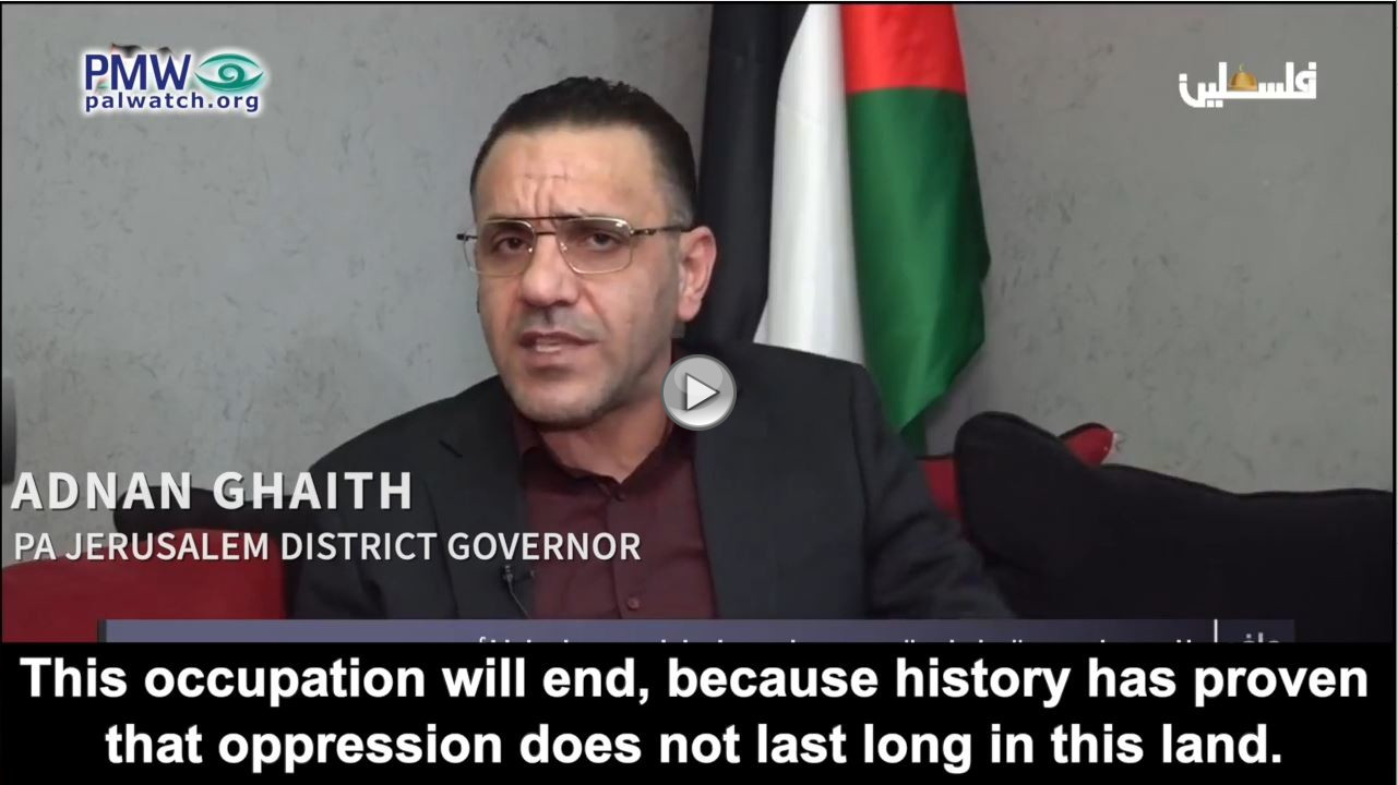 The anticipation that Israel's existence is temporary is another message that the PA frequently presents to Palestinians, and it was expressed again recently by PA Jerusalem District Governor Adnan Ghaith: