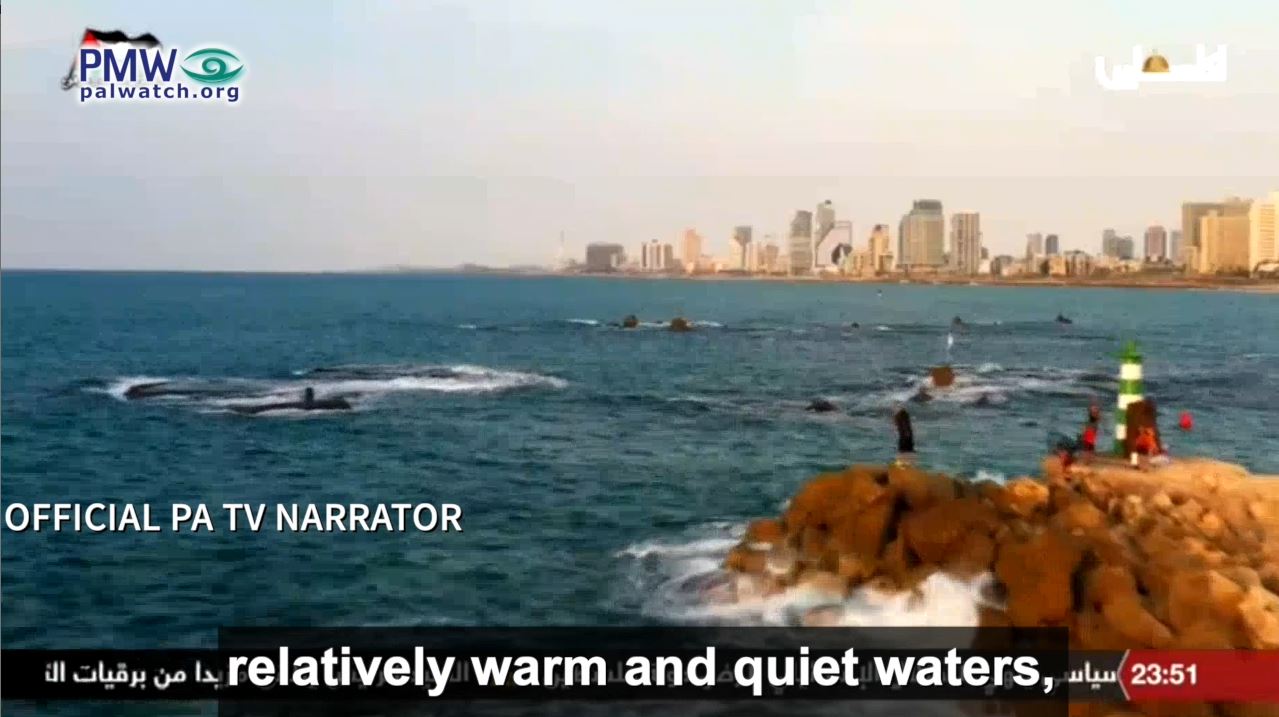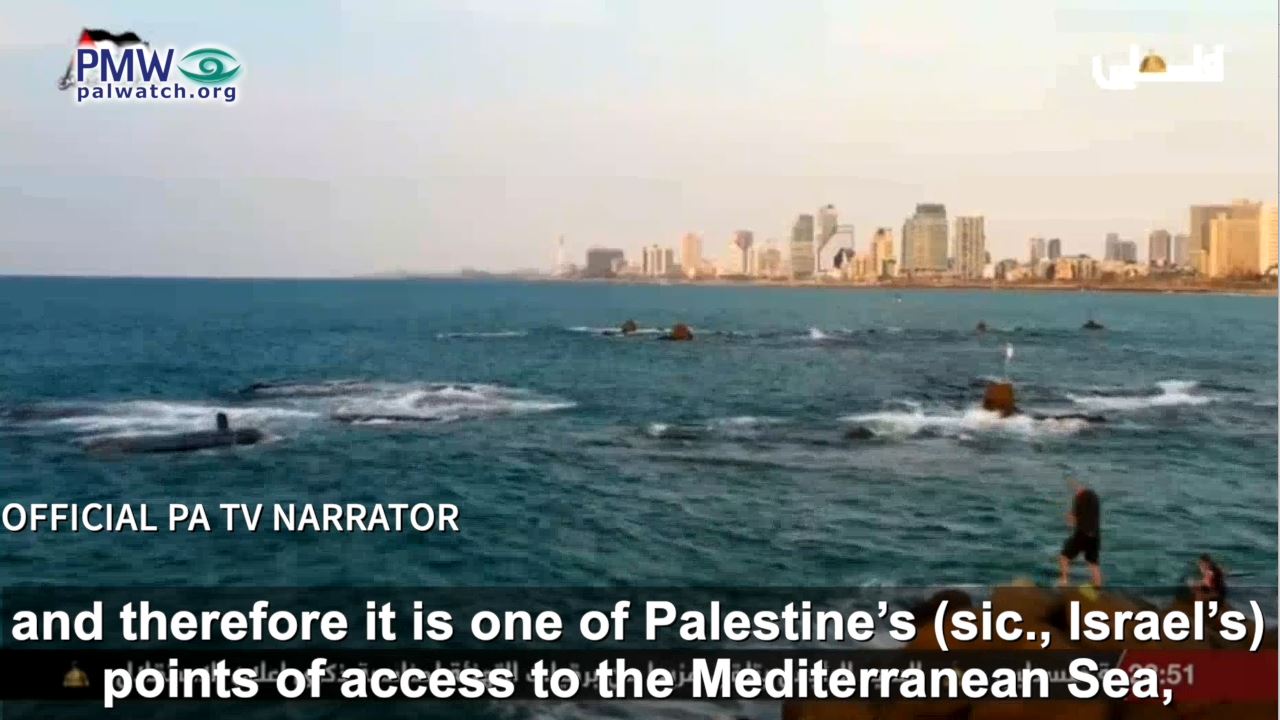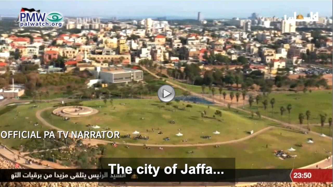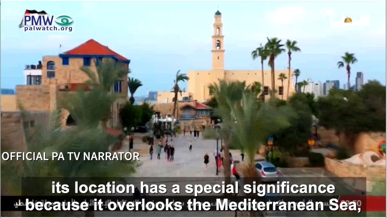 Official PA TV narrator: “The city of Jaffa… its location has a special significance because it overlooks the Mediterranean Sea, relatively warm and quiet waters, and therefore it is one of Palestine’s (sic., Israel’s) points of access to the Mediterranean Sea, and one of the country’s main gates to the west. Through it, Palestine connects to the Mediterranean Sea states and the states of Europe, Africa, and even America.”