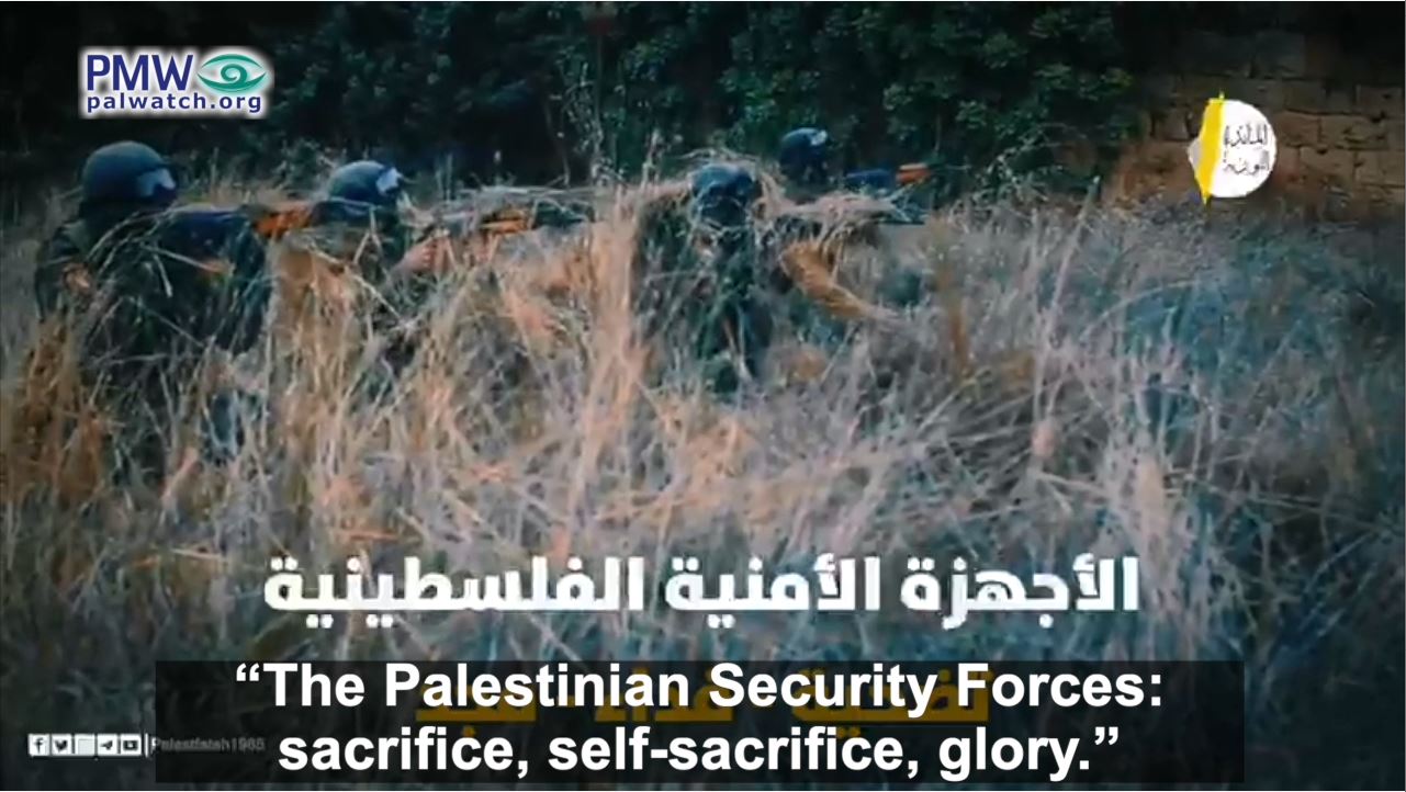 Text on screen: “The Palestinian Security Forces: sacrifice, self-sacrifice, glory.”
