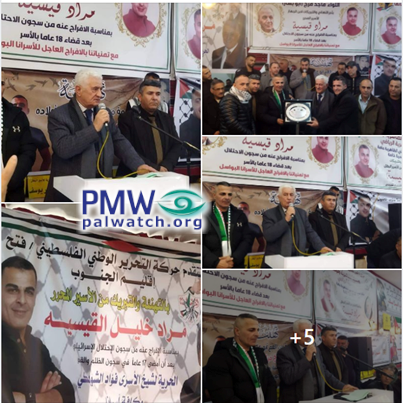 The images show Fatah Central Committee member Abbas Zaki at the welcoming ceremony for the released prisoner.