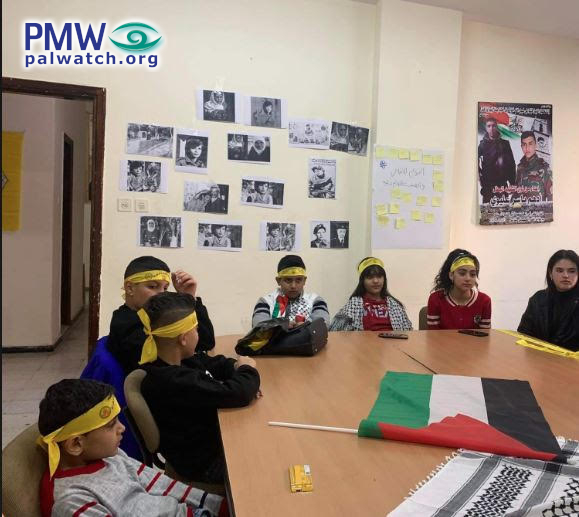 Like a silent classmate, mass murderer Dalal Mughrabi – who led the murder of 37 Israelis, among them 12 children – looks down at Palestinian kids participating in a course.
