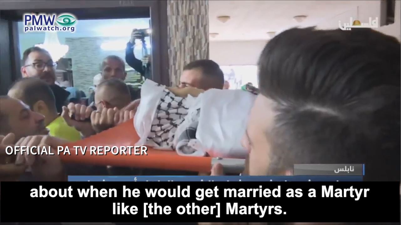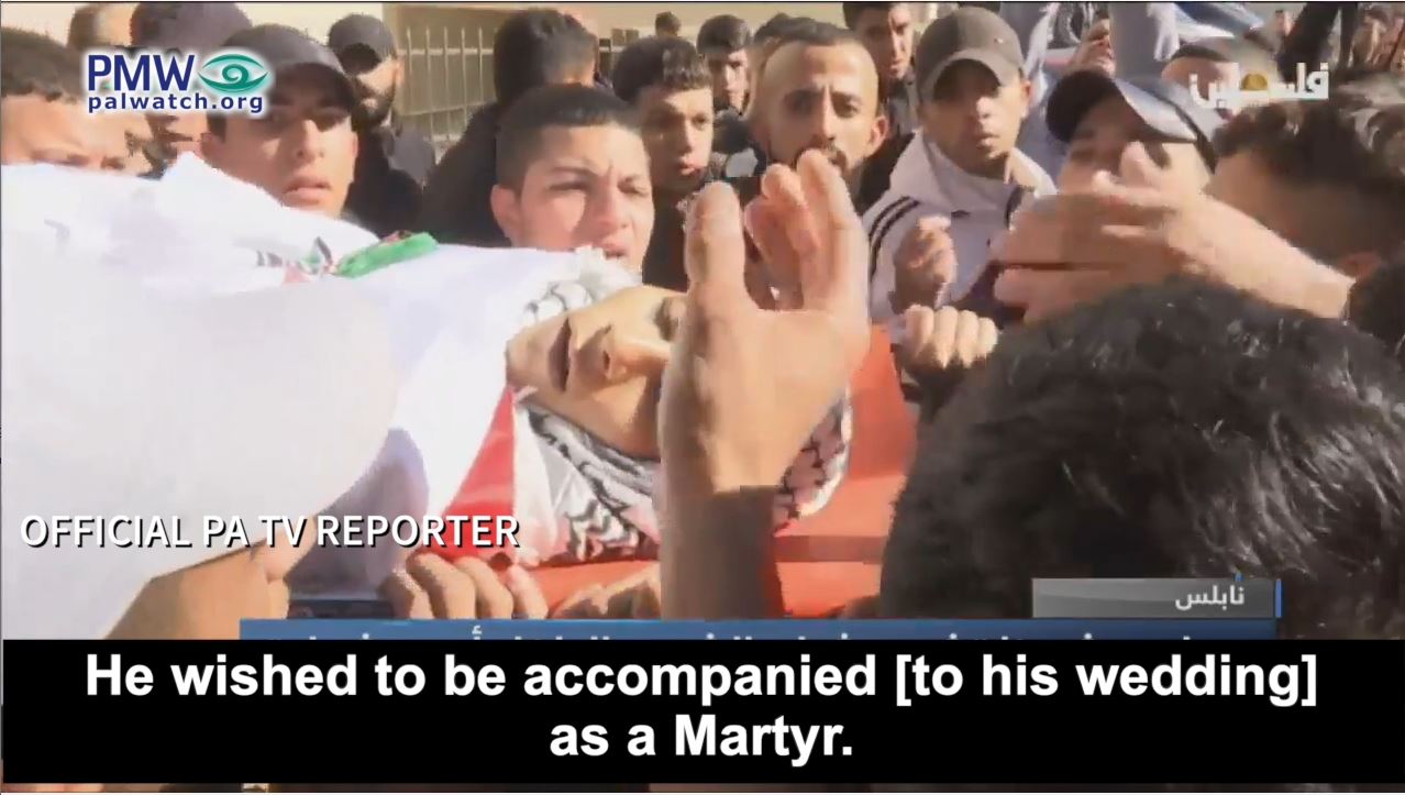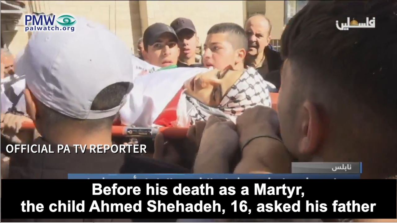 Official PA TV reporter: “He wished to be accompanied [to his wedding] as a Martyr. Before his death as a Martyr, the child Ahmed Shehadeh, 16, asked his father about when he would get married as a Martyr like [the other] Martyrs.”