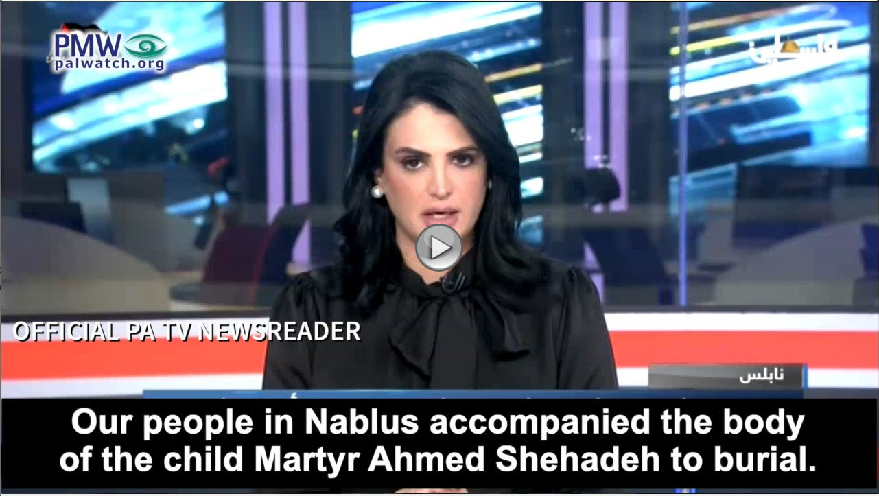 Official PA TV newsreader: “Our people in Nablus accompanied the body of the child Martyr Ahmed Shehadeh to burial.”