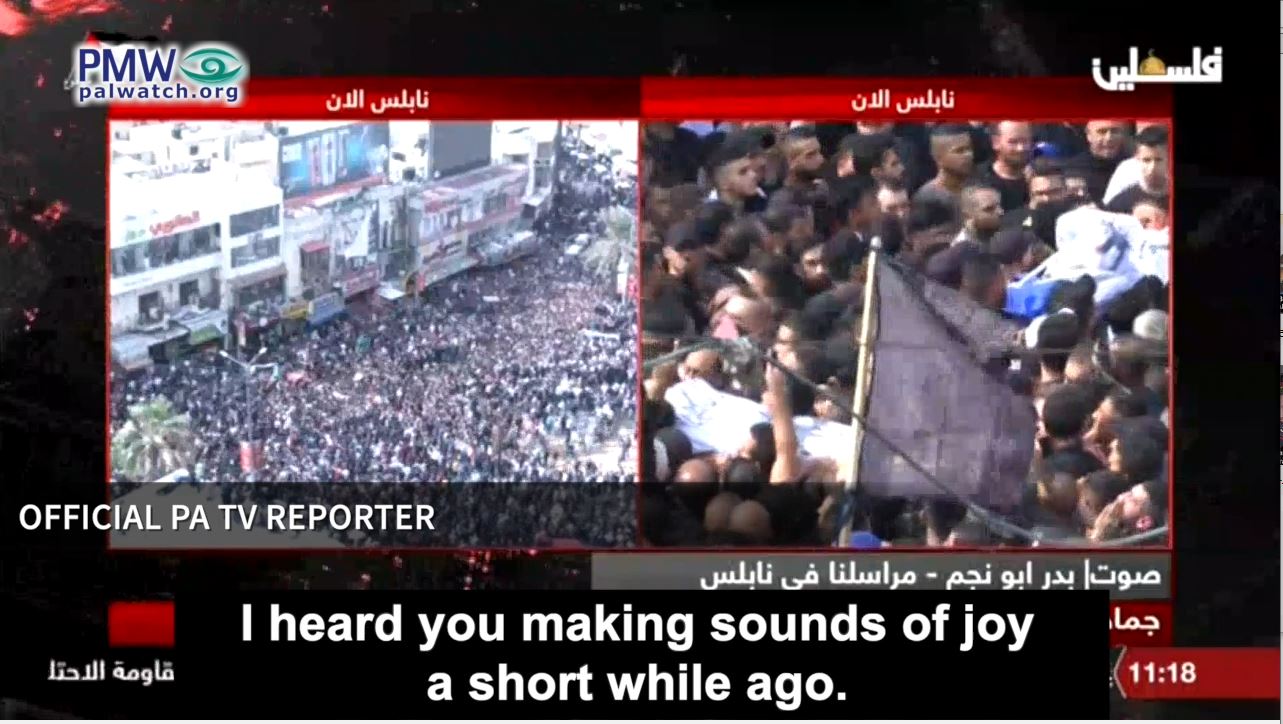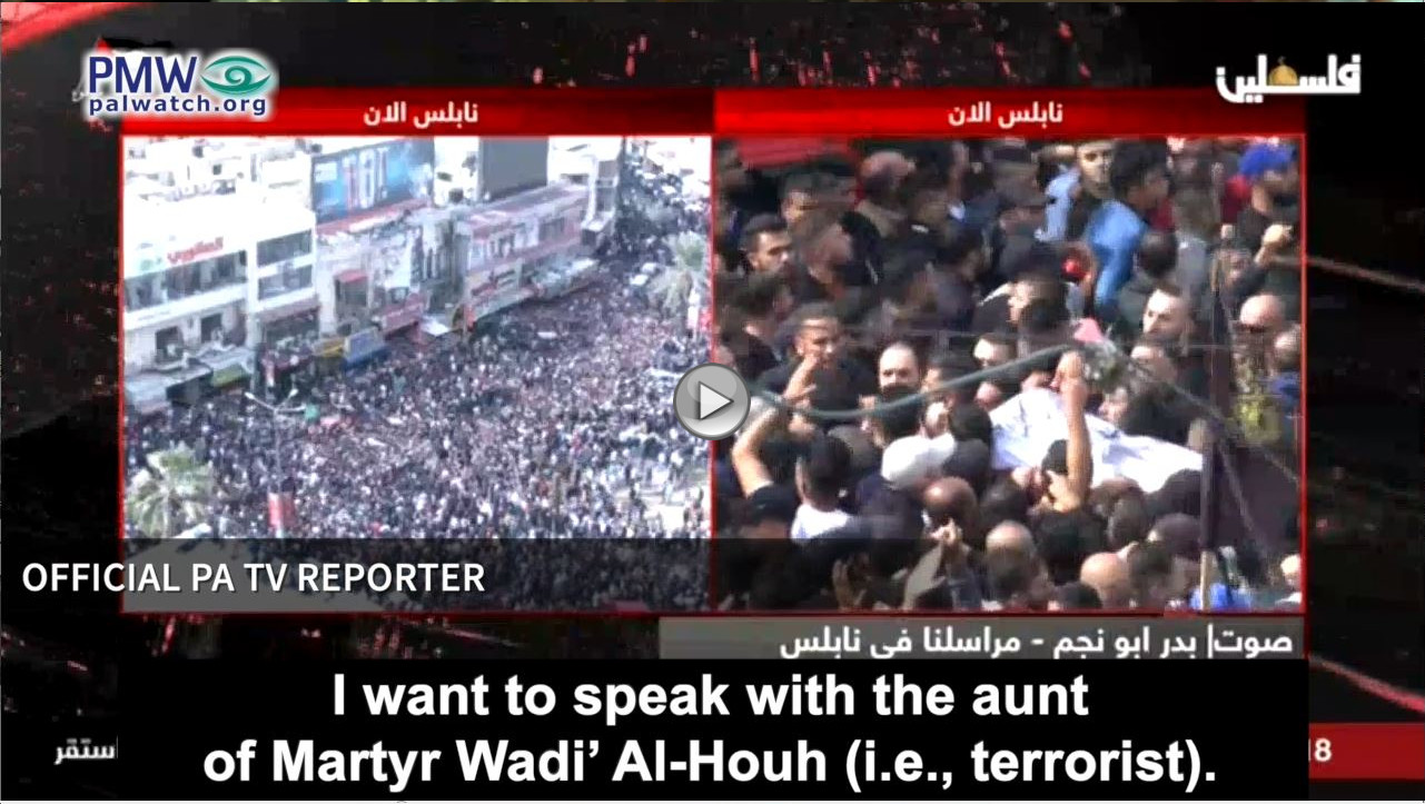 Official PA TV reporter: “I want to speak with the aunt of Martyr Wadi’ Al-Houh (i.e., terrorist). I heard you making sounds of joy a short while ago. These are the sounds of joy that we have grown accustomed to hearing at every Martyr’s funeral.”