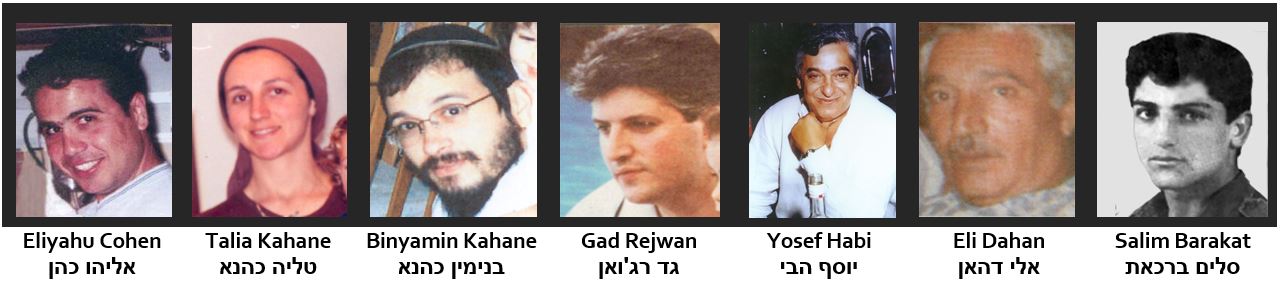 Eli Cohen, Binyamin and Talia Kahane, Gadi Rejwan, Yosef Habi, Eli Dahan, and Sergeant-Major Salim Barakat, were murdered in Jerusalem, Tel Aviv, and Samaria, in terror attacks that were planned by terrorist Nasser Abu Hmeid.