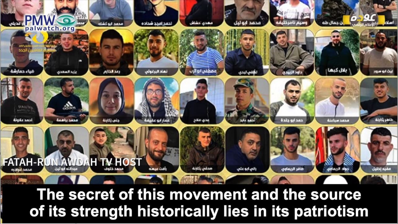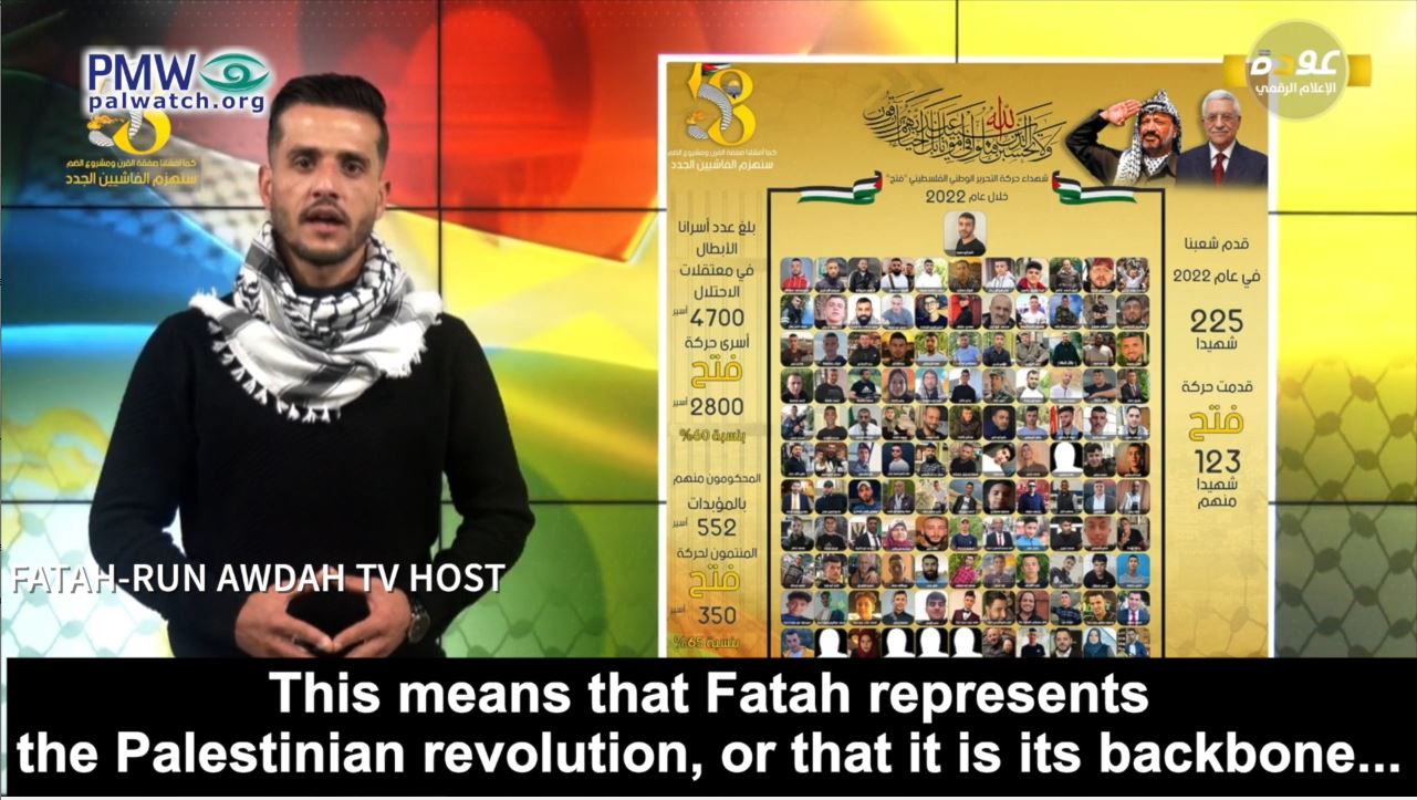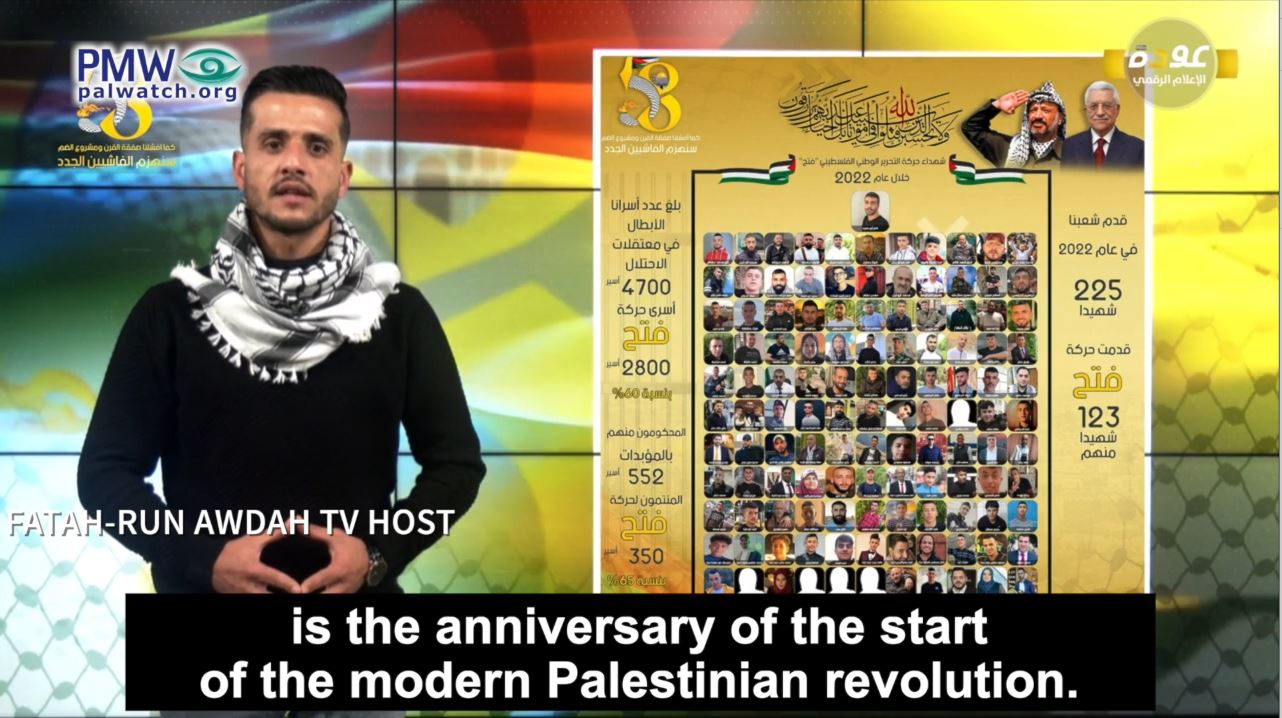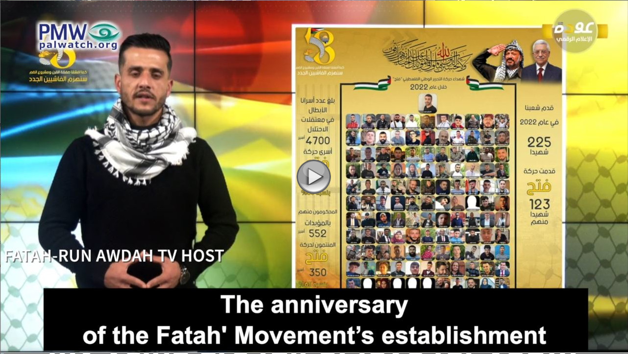 Fatah-run Awdah TV host: “The anniversary of the Fatah' Movement’s establishment is the anniversary of the start of the modern Palestinian revolution. This means that Fatah represents the Palestinian revolution, or that it is its backbone... The secret of this movement and the source of its strength historically lies in its patriotism that was expressed in 225 Martyrs since the start of this year [2022], with 123 of them being affiliated with Fatah. The number of prisoners in the prisons is 4,700 prisoners, with 2,800 of them, constituting 60%, being affiliated with Fatah. Among them, 552 prisoners were sentenced to life, with 350 of them, constituting 65%, being affiliated with Fatah. As His Honor [PA] President Mahmoud Abbas said, we will not prevent or cut off the money designated for the Martyrs’ families, the prisoners, and the released prisoners, as there are some who are attempting to do – even if we are only left with one penny, we will spend it on the Martyrs’ families and the prisoners.”
