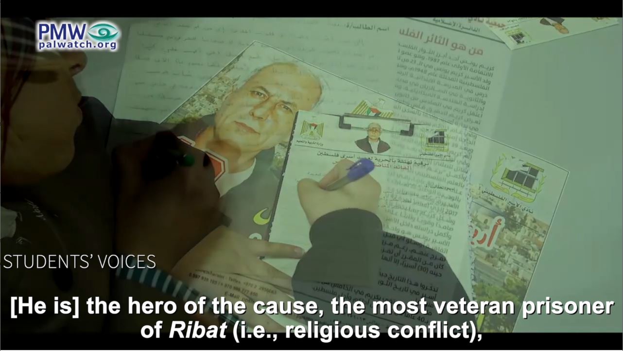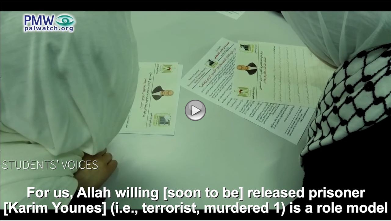 Students’ voices: “For us, Allah willing [soon to be] released prisoner [Karim Younes] (i.e., terrorist, murdered 1) is a role model of firmness, defiance, and achieving freedom. [He is] the hero of the cause, the most veteran prisoner of Ribat (i.e., religious conflict), a shining star in the occupation’s prisons. I send you my greetings, our heroic prisoners, full of the spirit of the great Martyrs, the sunset, and the height of darkness. Karim Younes, we are with you, the entire Palestinian people is with you.The time has come after 40 years, Allah willing your release will come. We are all with you. You are a man who sacrificed the best years of his youth for his homeland, for the people of Palestine.”