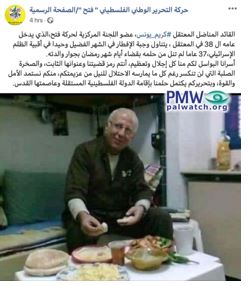 Posted text: “Fatah Movement Central Committee member and imprisoned fighter commander #Karim_Younes, who has begun his 38th year in prison, eats the Ramadan fast-breaking meal alone in the Israeli discrimination basements. For 37 years he has not gotten to spend the days of Ramadan with his mother.Our heroic prisoners – we send you [our] full appreciation and admiration; you are the symbol of our cause and its prominent embodiment, the solid rock that does not break despite all the occupation’s steps to harm your determination. We draw hope and strength from you, and with your release our dream will be completed in the establishment of an independent Palestinian state whose capital is Jerusalem.”