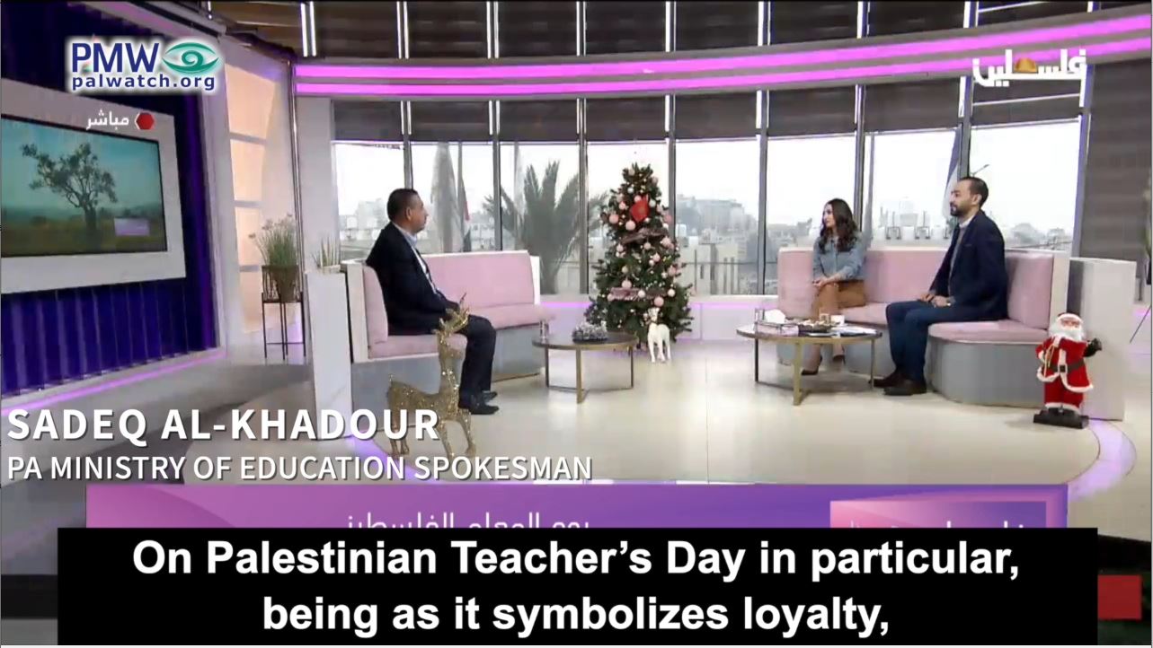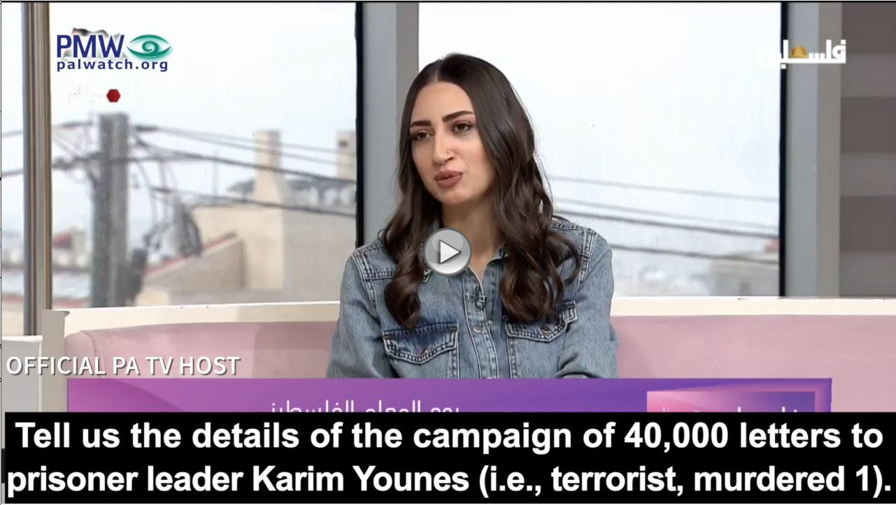 Official PA TV host: “When we speak about the Palestinian teacher, we speak about building the people’s education, and building social thinking… Tell us the details of the campaign of 40,000 letters to prisoner leader Karim Younes (i.e., terrorist, murdered 1 together with an accomplice).”