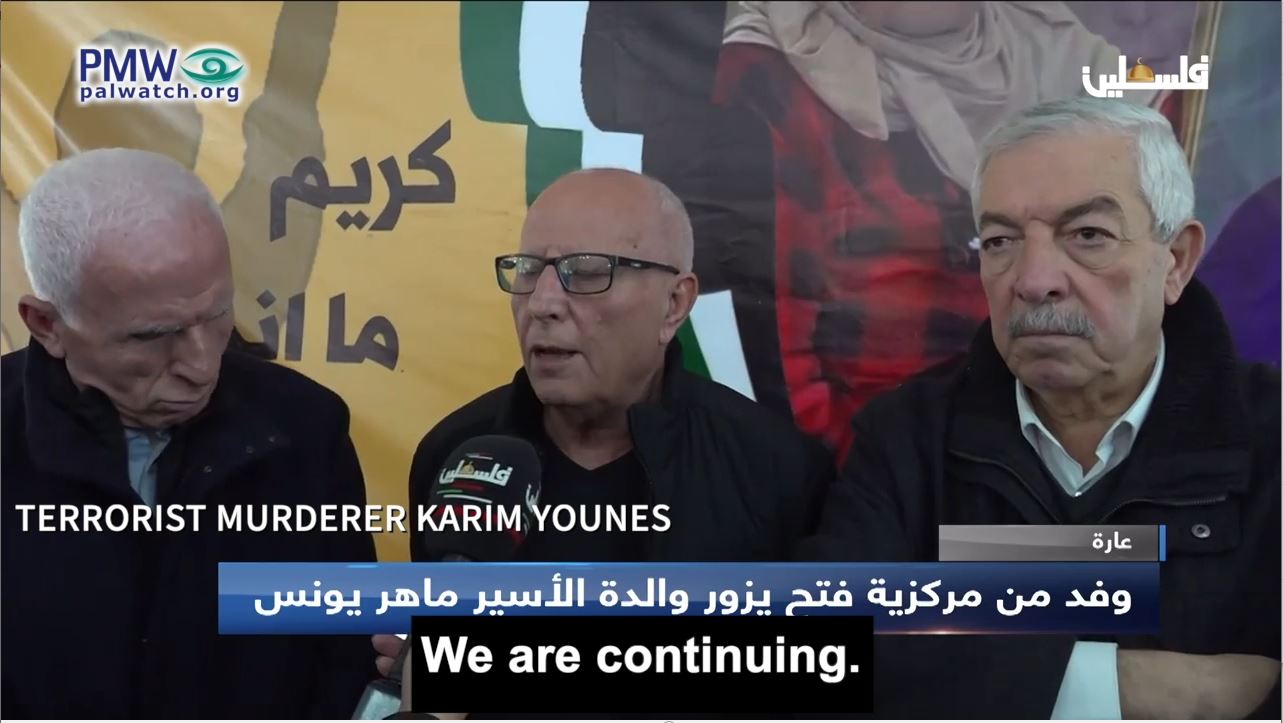 “[PA] President Mahmoud Abbas called fighter Karim Younes (i.e., terrorist, murdered 1 together with an accomplice) yesterday [Jan. 5, 2023] to congratulate him on his release from the occupation’s prisons after 40 years of imprisonment.During the phone conversation with fighter Karim Younes, the president said: ‘Welcome to your homeland and your land free and honored. We bless ourselves and the Palestinian people with your freedom.’