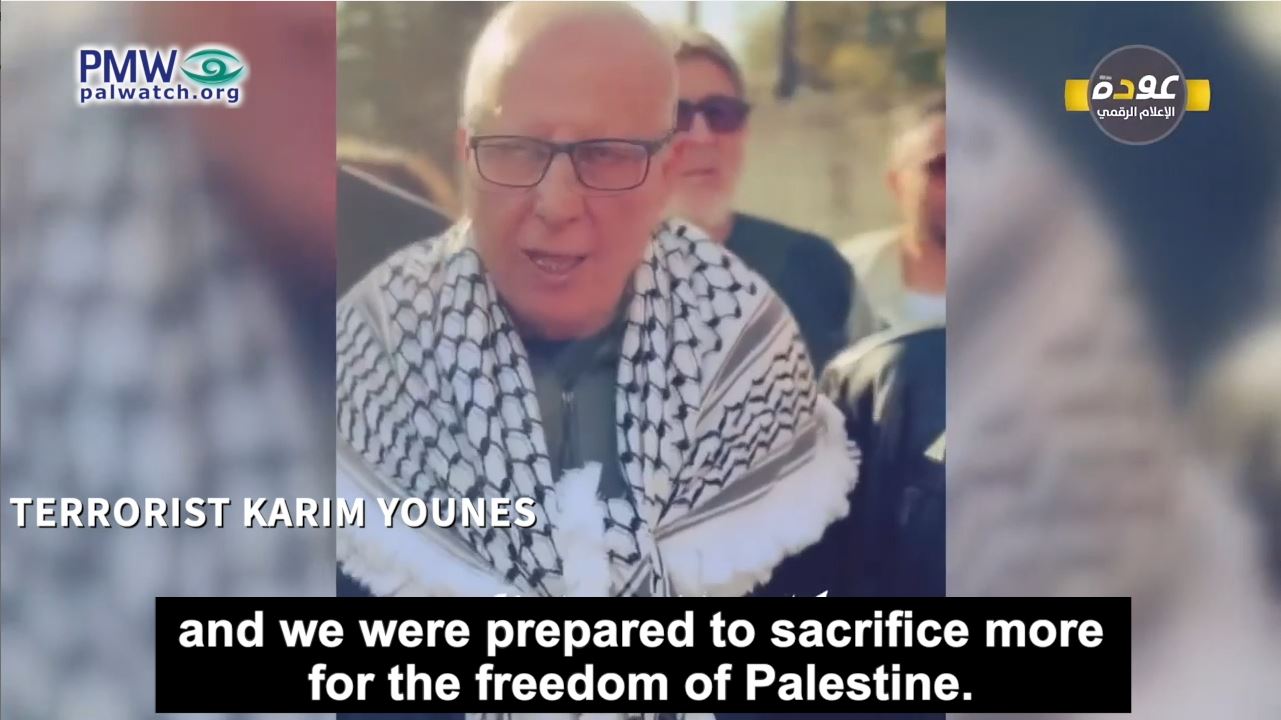 “The Fatah Movement Central Committee congratulated our people over the freedom of leader Karim Younes (i.e., terrorist, murdered 1 together with an accomplice), the most veteran prisoner in the world (sic., Younes did not serve the longest sentence in the world), after more than 350,000 hours, more than 14,000 days, and 40 years that he served in the Israeli occupation’s prisons.