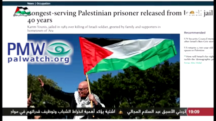Official PA TV host: “The release of prisoner Karim Younes– a picture of Karim Younes carrying the Palestinian flag in the celebrations for his release, as was published on the website Middle East Eye.”
