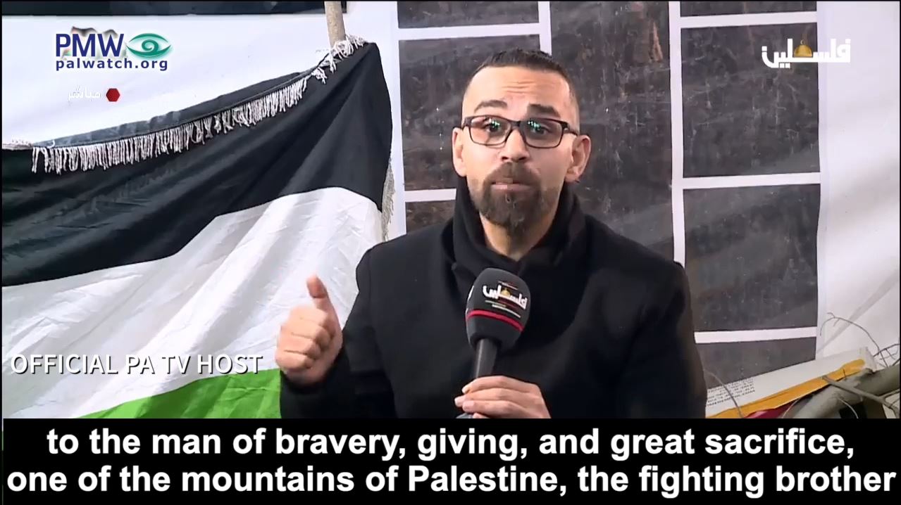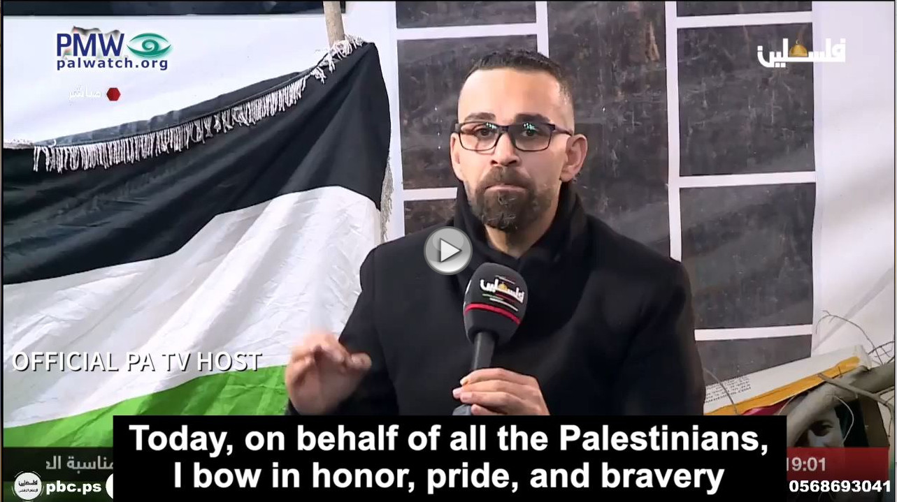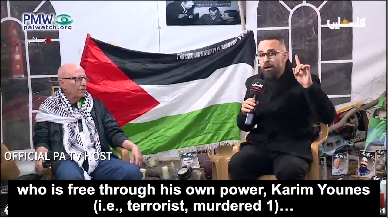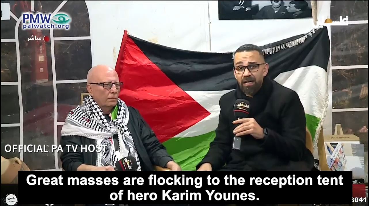Official PA TV host: “Today, on behalf of all the Palestinians, I bow in honor, pride, and bravery to the man of bravery, giving, and great sacrifice, one of the mountains of Palestine, the fighting brother who is free through his own power, Karim Younes… Great masses are flocking to the reception tent of hero Karim Younes.”