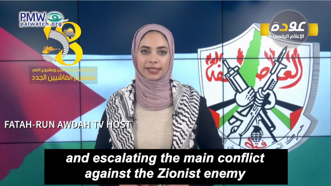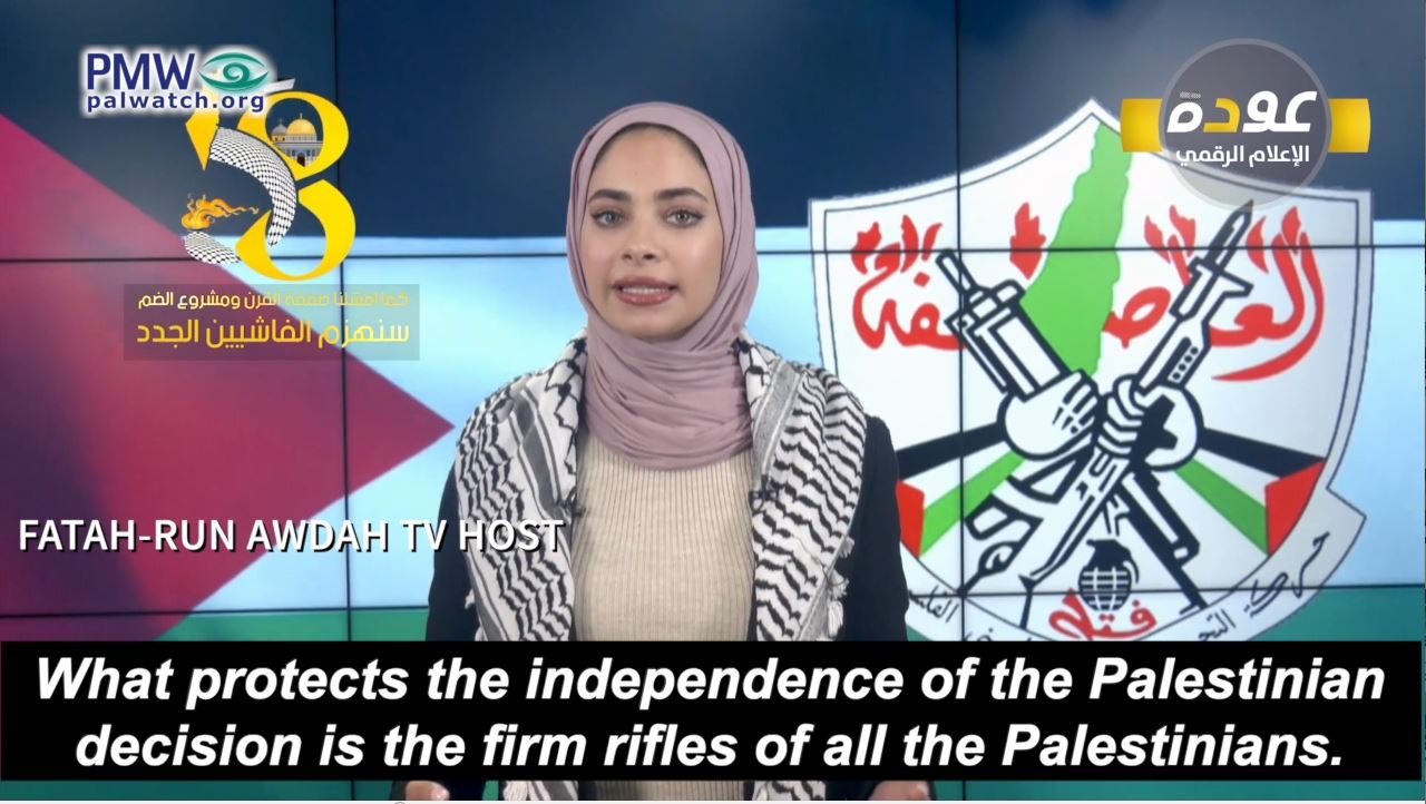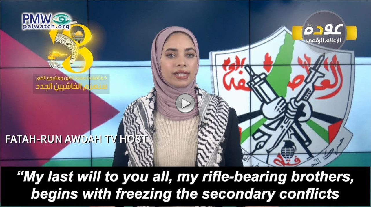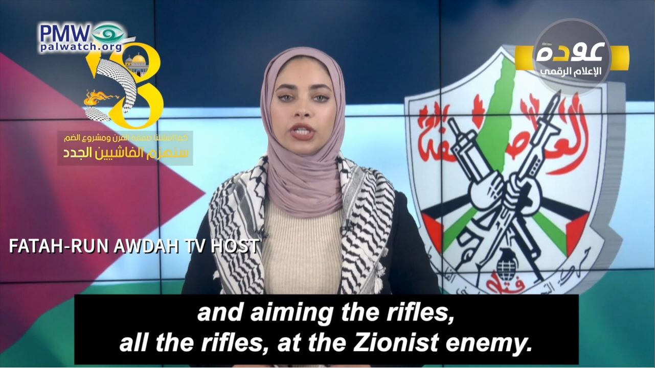 Fatah-run Awdah TV host: “‘My last will to you all, my rifle-bearing brothers, begins with freezing the secondary conflicts and escalating the main conflict against the Zionist enemy and aiming the rifles, all the rifles, at the Zionist enemy. What protects the independence of the Palestinian decision is the firm rifles of all the Palestinians. I say to all my brothers wherever they are to continue on the same path we went on.’ This is the last will of Dalal Mughrabi, or ‘the Bride of Jaffa’ as the Palestinians call her, who was full of love for the homeland and dedicated her life to see it free and proud. Dalal carried out an operation (i.e., terror attack) against the occupation, through which she wanted to teach it a painful lesson by striking its [territorial] depth, and thus she wrote with her blood a new page in the history of the Palestinian resistance in 1978.”