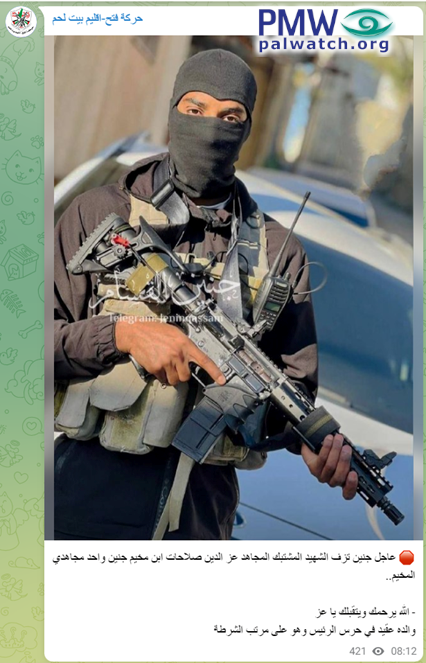 Posted text: “Jenin accompanies to [his] wedding (i.e., a Martyr's funeral is considered his wedding to the 72 Virgins in Paradise in Islam) fighting Martyr and Jihad fighter Izz Al-Din Salahat (i.e., terrorist, shot at Israeli soldiers), a son of the Jenin [refugee] camp, and one of the camp’s fighters.