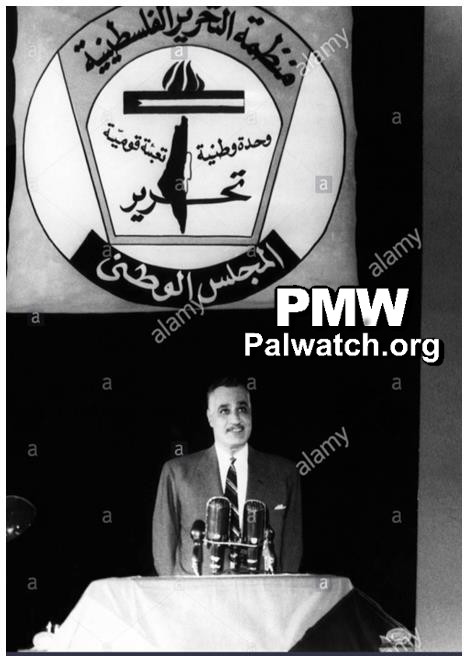 The image shows the PLO logo with Gamal Abdel Nasser, the President of Egypt in 1956-1970, standing under it.