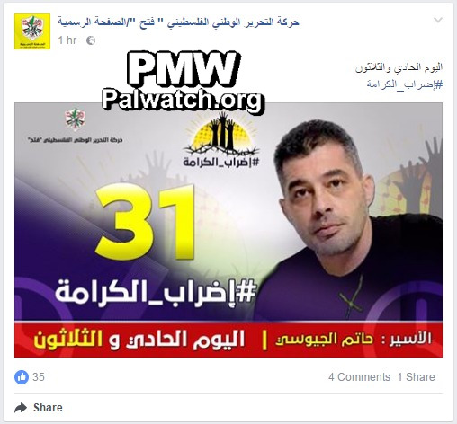 The image shows terrorist Hatem Al-Jayousi who knowingly and willingly provided a car to transport a terrorist who carried out a shooting attack, murdering 6 and wounding dozens of others. Behind him is a picture of hands reaching through barbed wire. At the top center is the symbol of the hunger strike that began on April 17, 2017, showing hands reaching through barbed wire with the text "The_[hunger_]strike_of_dignity" beneath the hands. At the top left is the Fatah logo that includes a grenade, crossed rifles, and the PA map of “Palestine” that presents all of Israel as “Palestine” together with the PA areas, with "Palestinian National Liberation Movement 'Fatah'" written underneath it.