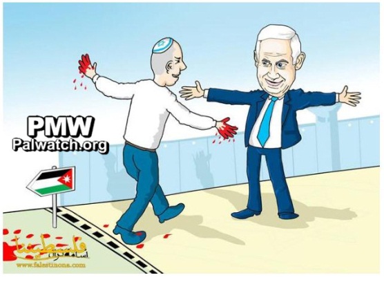 The cartoon shows Israeli Prime Minister Benjamin Netanyahu ready to hug Israeli security guard Ziv Moyal, whose hands are dripping with blood and who is depicted wearing a kippah (Jewish skullcap) bearing the Star of David on it, as he crosses the border from Jordan into Israel. Moyal shot and killed a Jordanian terrorist in self-defense and in the process accidentally shot and killed a Jordanian bystander.